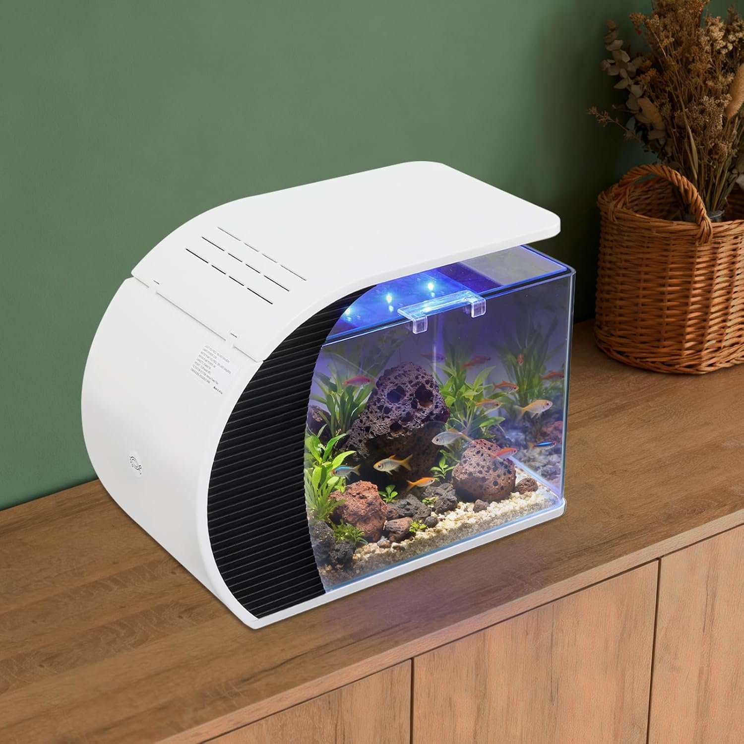 Dieses kompakte Tischaquarium vereint künstlerischen Reiz mit Alltagstauglichkeit und ist ideal für die Schaffung einer bezaubernden Unterwasseroase in Ihrem Zimmer. Es besteht aus klarem Glas und verspricht eine lange Lebensdauer und brillante Sicht. Die Wasserpumpe und der Filter halten das Wasser sauber und die Ambientebeleuchtung sorgt für bezaubernde Wasserlichteffekte. Es verwandelt Ihren Raum mit seiner ruhigen Landschaft und bringt ein Stück Natur in Ihren Alltag, egal ob Tag oder Nacht.