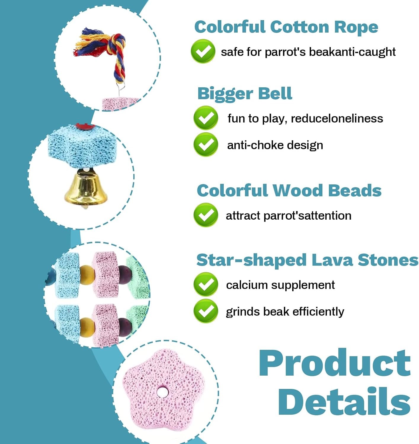 ACHTUNG – Der bunte Schleifstein ist sternförmig geschliffen, was das Kauen erleichtert. Mit bunten Perlen und einer Glocke, die einerseits die Aufmerksamkeit der Papageien auf sich zieht und andererseits den Käfig schmückt, ist er ein lustiges Spielzeug.