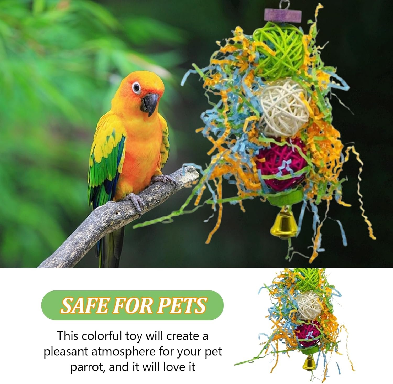 Natürliche Qualität: Vogelspielzeug besteht aus essbaren Materialien wie Naturholz und Bast und ist mit sicheren, essbaren Pigmenten gefärbt. Es ist leuchtend bunt und ungiftig. Alle Materialien des Vogelspielzeugs haben strenge Qualitätskontrollen bestanden, sind kaubeständig und enthalten keine Rückstände. Dies vermeidet das Risiko eines versehentlichen Fressens durch Vögel und gewährleistet die Gesundheit von Vogelliebhabern.