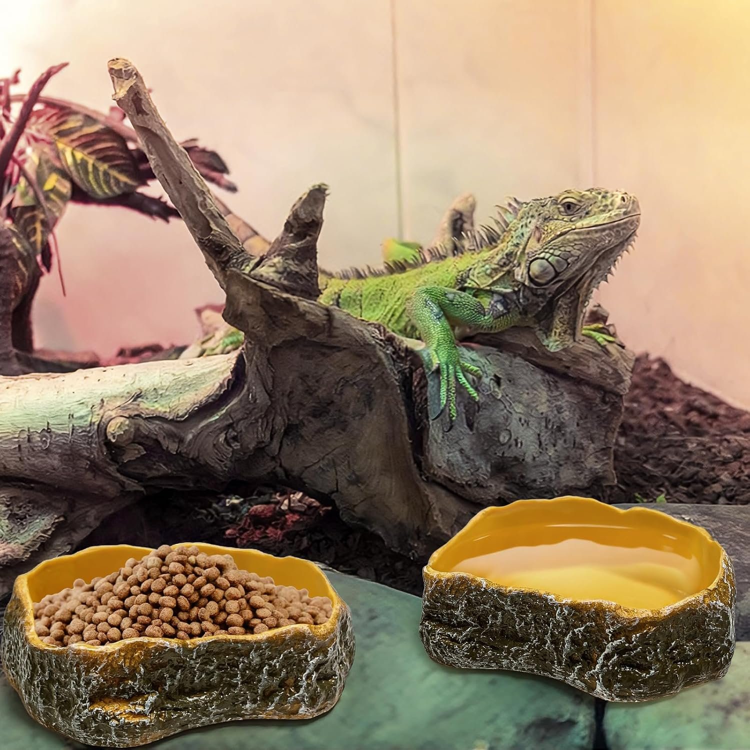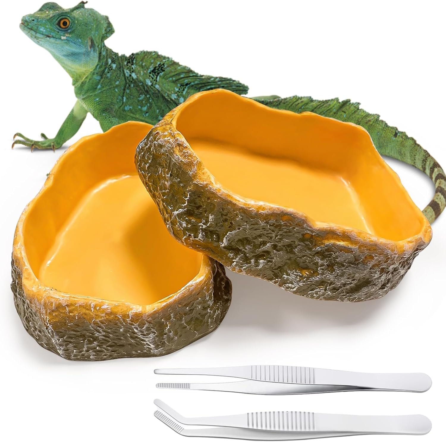 Enthält zwei Futternäpfe in Natursteinform und zwei Spezialpinzetten – für müheloses getrenntes Füttern von Trocken- und Nassfutter. So können Sie sicher sein, dass Ihr Gecko, Ihre Kröte oder Ihre kleine Eidechse gesunde Mahlzeiten genießen können, während Sie Ihre Pflegeaufgaben vereinfachen können.
