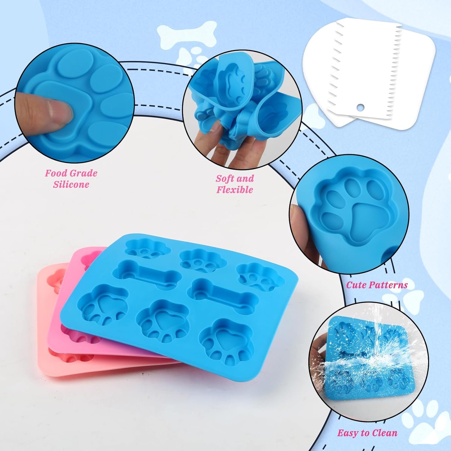 1. Das Set enthält drei verschiedenfarbige Silikonformen in Form von Knochen und Hundepfoten sowie drei Spatel in unterschiedlichen Formen.