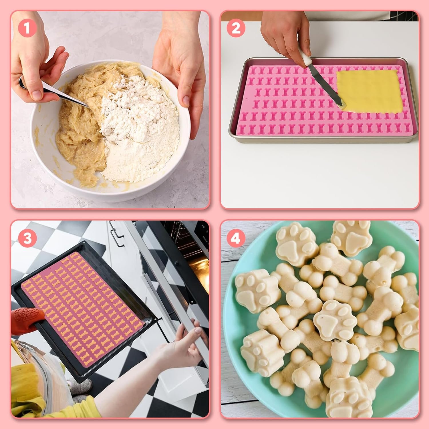 Einfache Anwendung: Für leckere Hundekekse einfach den flüssigen Teig auf die Backform geben, mit dem Schaber glatt streichen und in den Ofen schieben – auch für Kinder geeignet