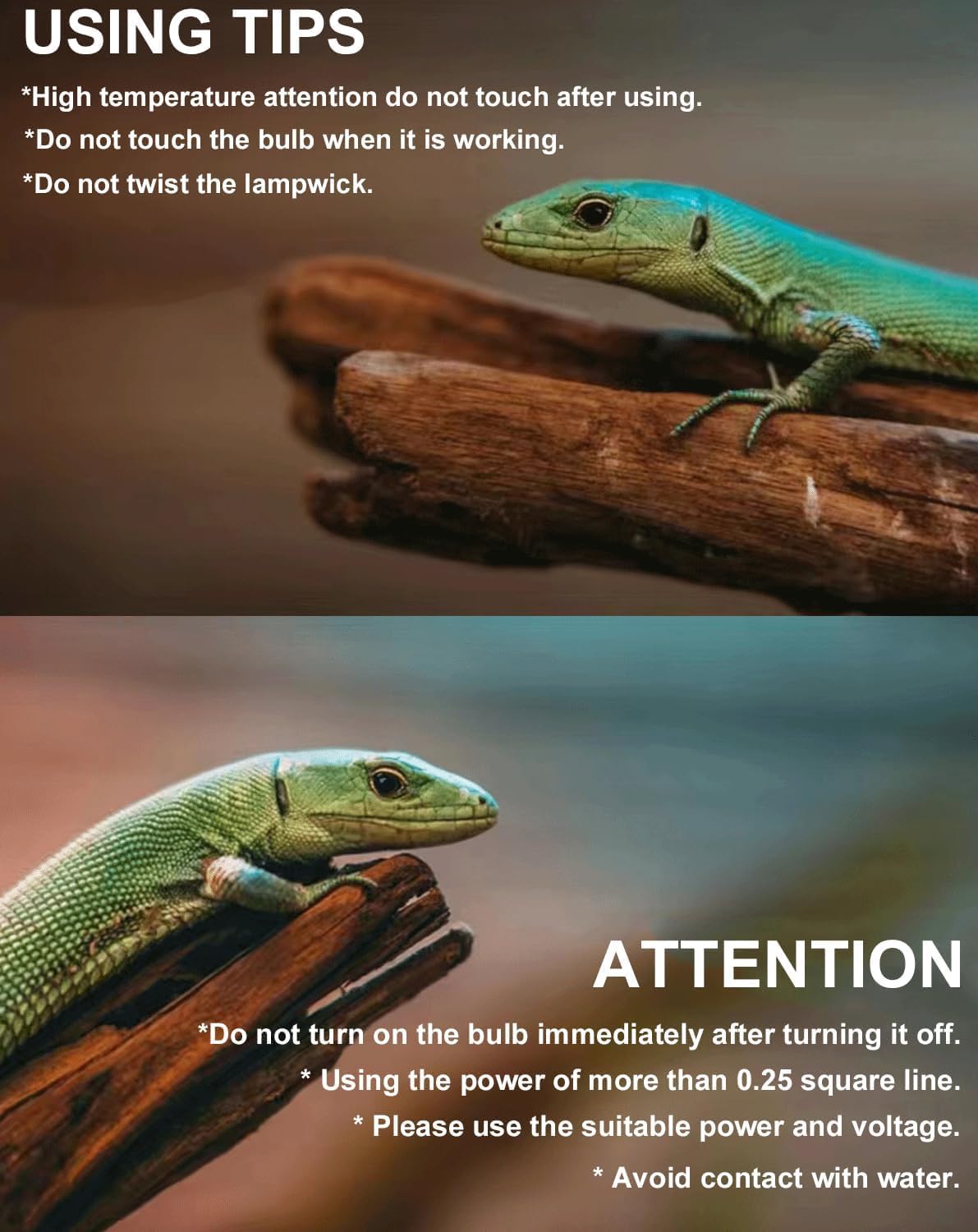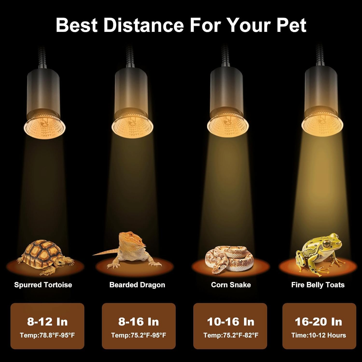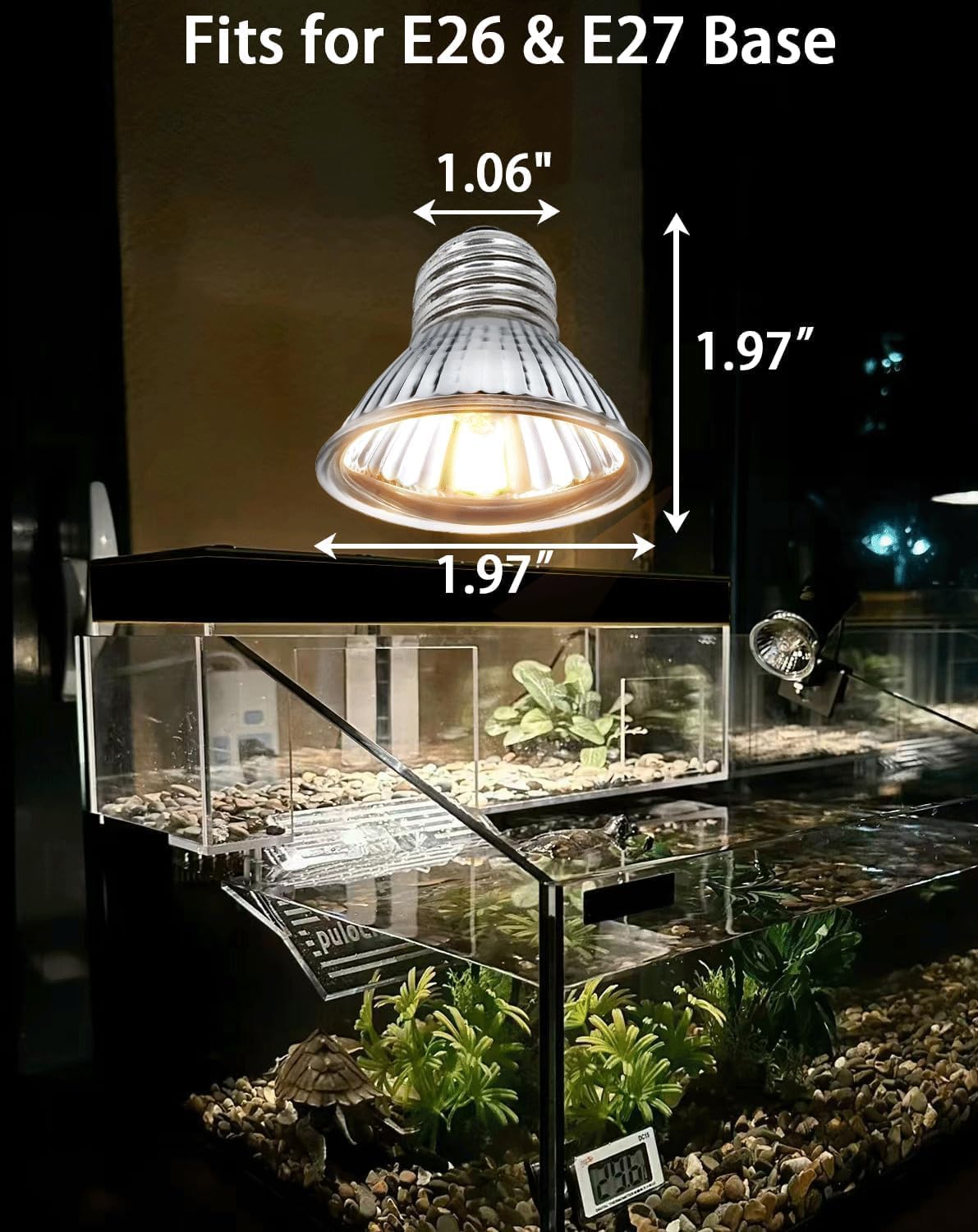 Reptilien-Heizlampe mit ROHS- und CE-Zertifizierung, lange Lebensdauer. TIPPS: Die Oberflächentemperatur der Heizlampen ist im Allgemeinen hoch. Bitte halten Sie einen Abstand von 20 bis 30 cm zum Rücken der Schildkröte ein