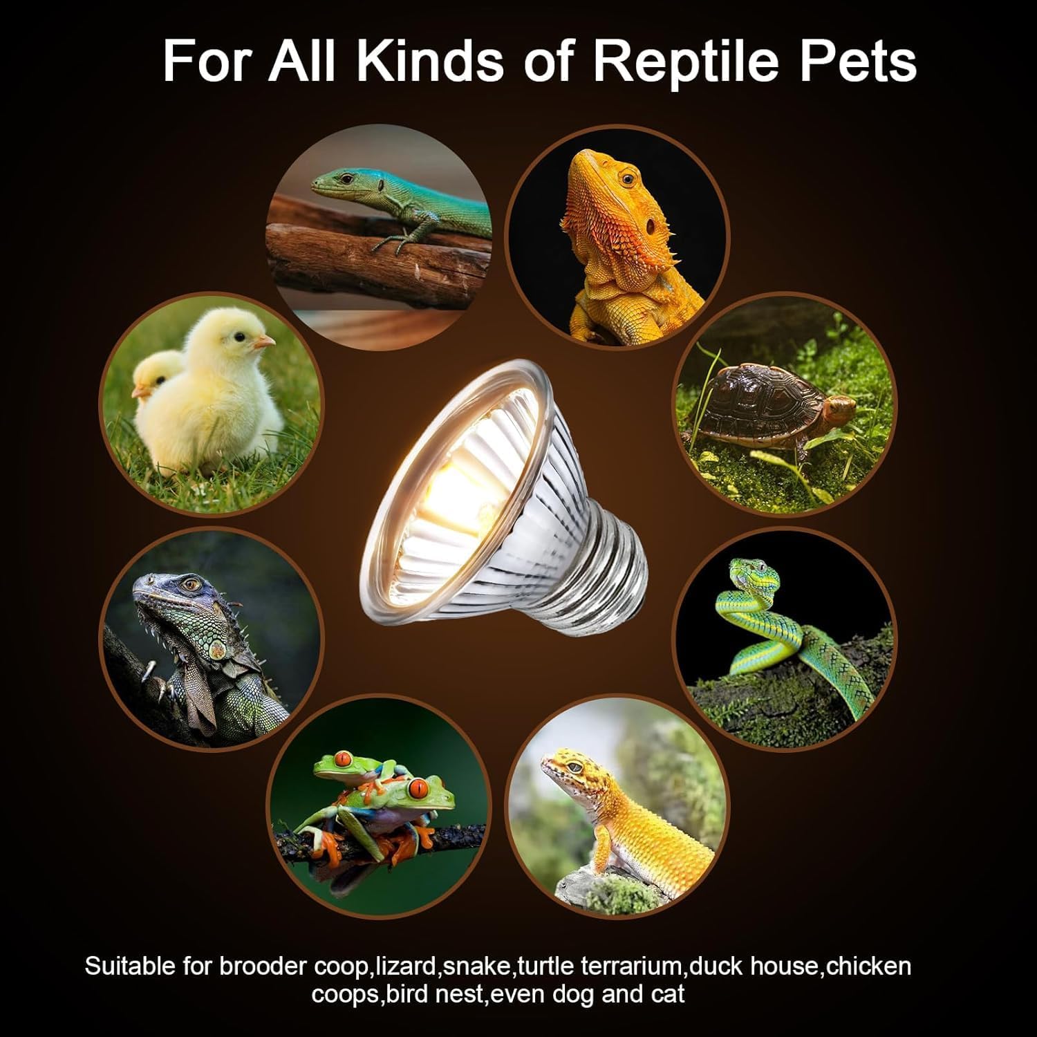 Unsere 4er-Pack 50-W-Reptilienlampen sorgen für zusätzliche Wärme und helles Licht, um Sonnenschein nachzuahmen und UVA- und UVB-Licht zu erzeugen