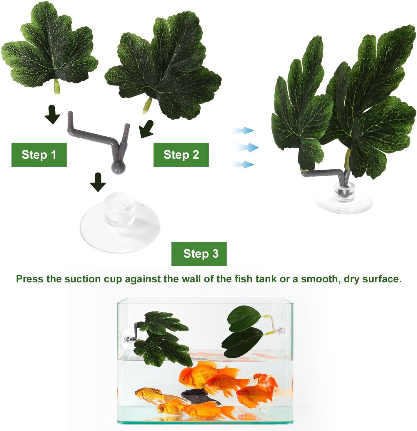 Einfache Installation: Zur Installation sind nur 3 Schritte erforderlich. Setzen Sie zunächst das Fischblatt-Pad in die Halterung ein. Zweitens setzen Sie die Halterungen in die Saugnäpfe ein. Drittens drücken Sie die Saugnäpfe an die Wand des Aquariums. (Tipp: Bitte halten Sie Fischblattpolster von der Pumpe oder dem Einlass fern.)