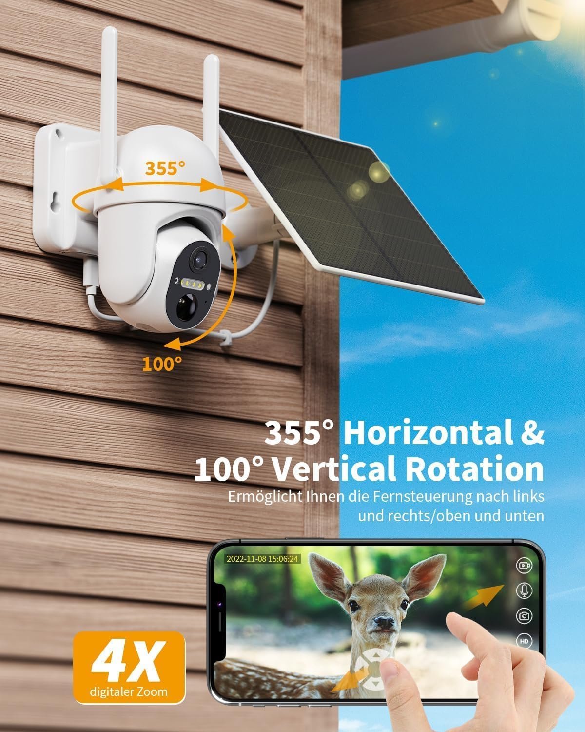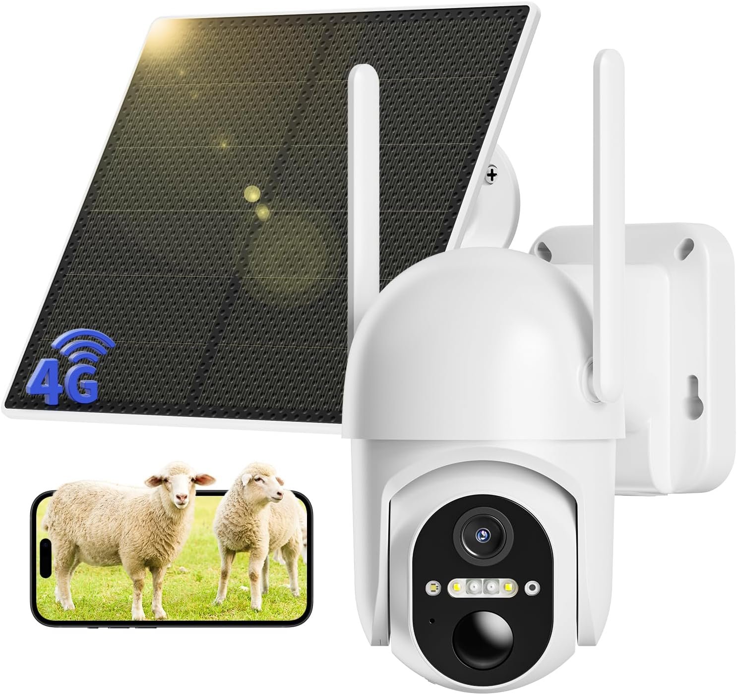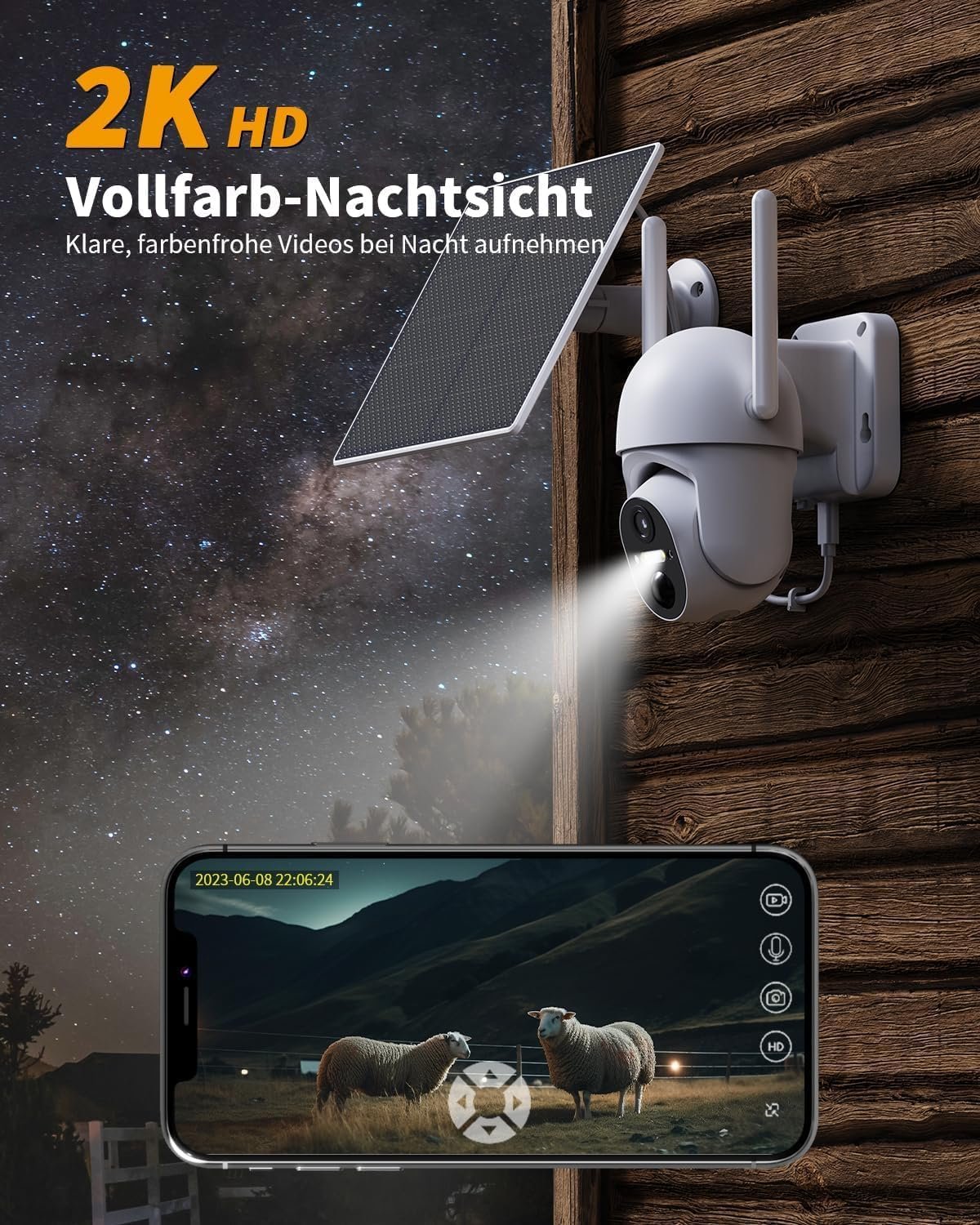 Mit 2K Super HD für jede Ecke: Mit einem integrierten Scheinwerfer und einem fortschrittlichen Bildsensor nimmt diese 2K 4G-Außenüberwachungskamera Tag und Nacht 2K-Fotos und -Videos auf. Über ein 4G-Netzwerk, 355°-Schwenk, 100°-Neigung und 4-fach-Digitalzoom können Sie über Ihr Mobiltelefon auf die Überwachungskamera im Freien zugreifen, auch wenn Sie nicht in der Heimatstadt sind, um einen Echtzeitüberblick über Ihre Farm, Ranch oder Baustelle zu erhalten.