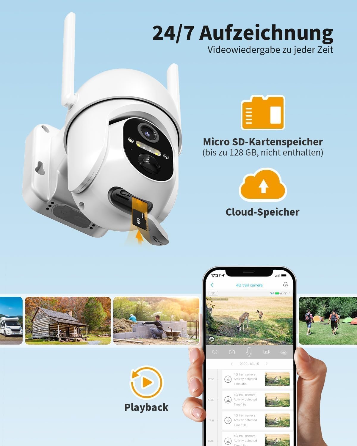 Überwachungskamera mit SIM-Karte und 32 GB Speicherkarte: NUASI 4G Überwachungskamera Outdoor Akku unterstützt 3G/4G-Netzwerke wie Vodafone/Wind Tre/Telekom/Orange etc. Im Lieferumfang sind eine Prepaid-SIM-Karte (mit 7-tägiger Testphase) und eine 32 GB Speicherkarte enthalten. Nachdem das Datenvolumen aufgebraucht ist, kann es für 12,90 € pro Monat (es gibt auch andere Datentarife) über die App verlängert werden.