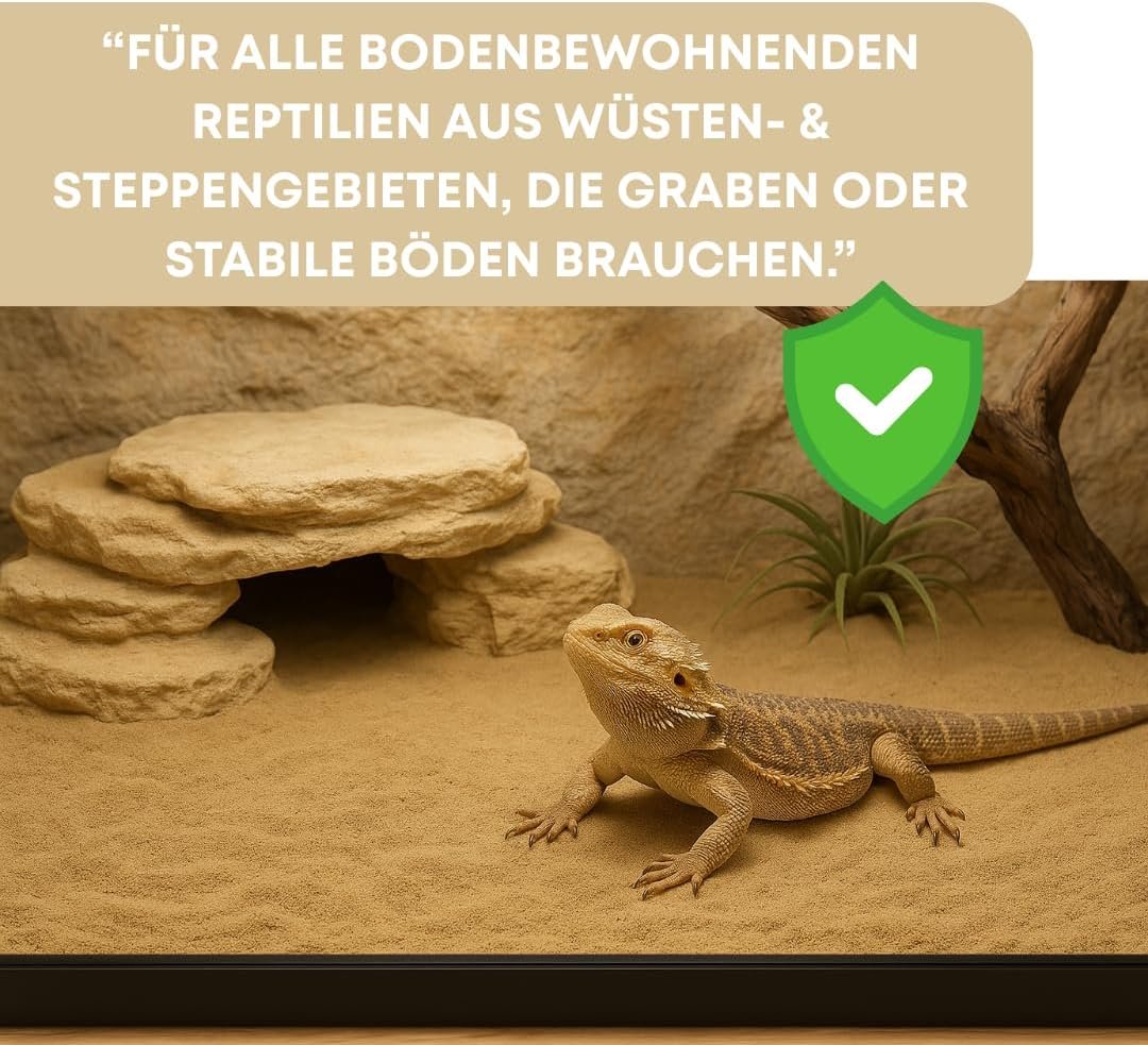 Samtweiche und abgerundete Kanten – unserer Tonbasis werden ausschließlich abgerundete Quarzsandkörner beigemischt, um die Verletzungsgefahr für die Terrarienbewohner zu verringern. Dank der abgerundeten Sandkörner ist es besonders für empfindliche Reptilienhaut geeignet.