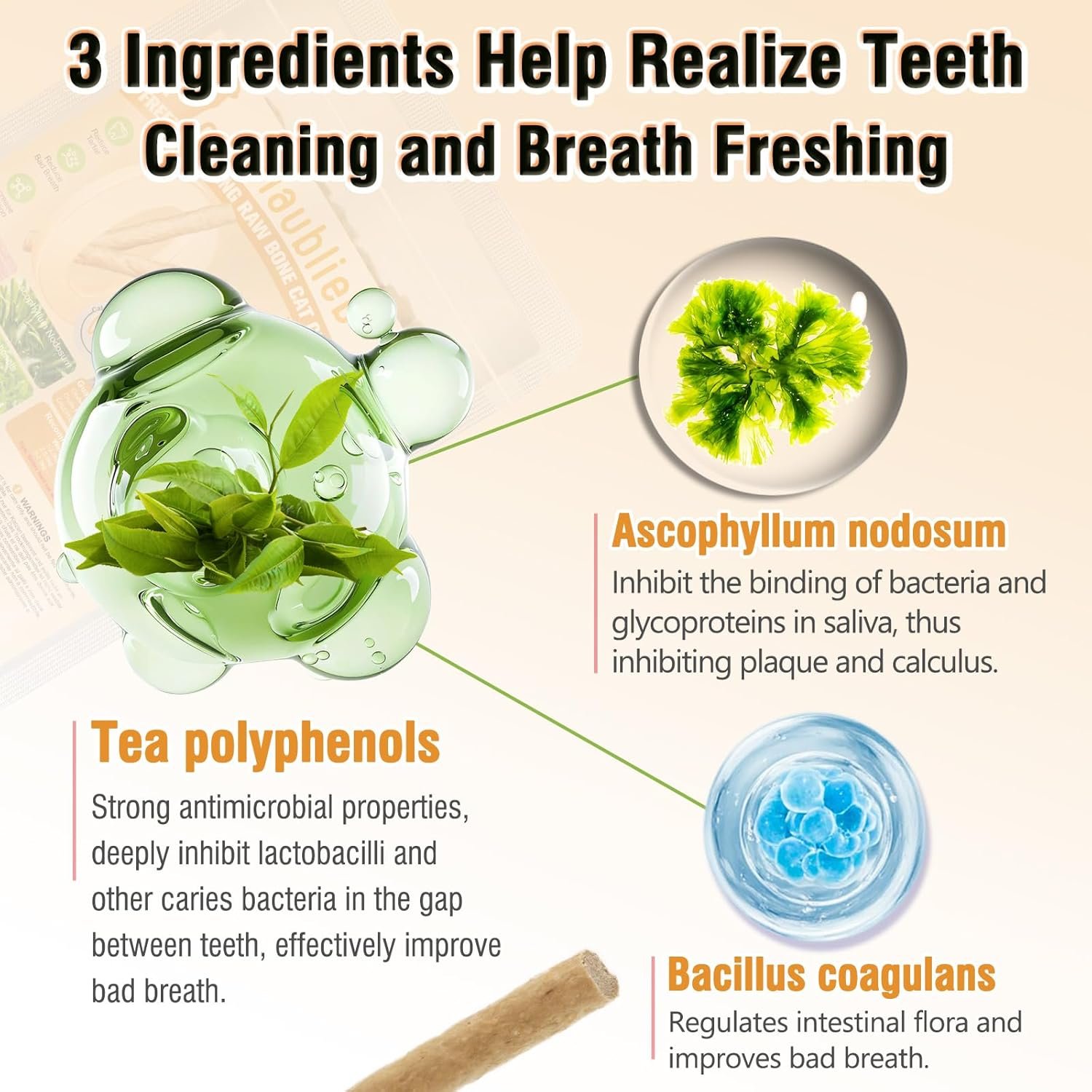 Wirksam gegen Mundgeruch und Plaque: mit Tee-Polyphenolen und Ascophyllum nodosum zur Hemmung der Plaque- und Zahnsteinbildung sowie Probiotika (Bacillus coagulans) zur Unterstützung der Verdauung und für frischeren Atem