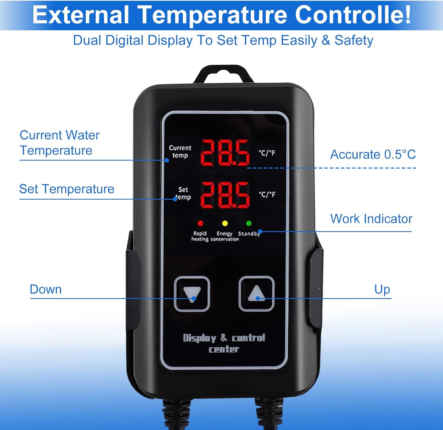 Automatische Temperaturkonstanthaltung: Elektrische Poolheizung, das intelligente System hält die Wassertemperatur konstant im Bereich von 18–35 °C. So genießen Ihre Fische stets optimale Bedingungen ohne manuelle Anpassungen an Ihrem Aquarium.