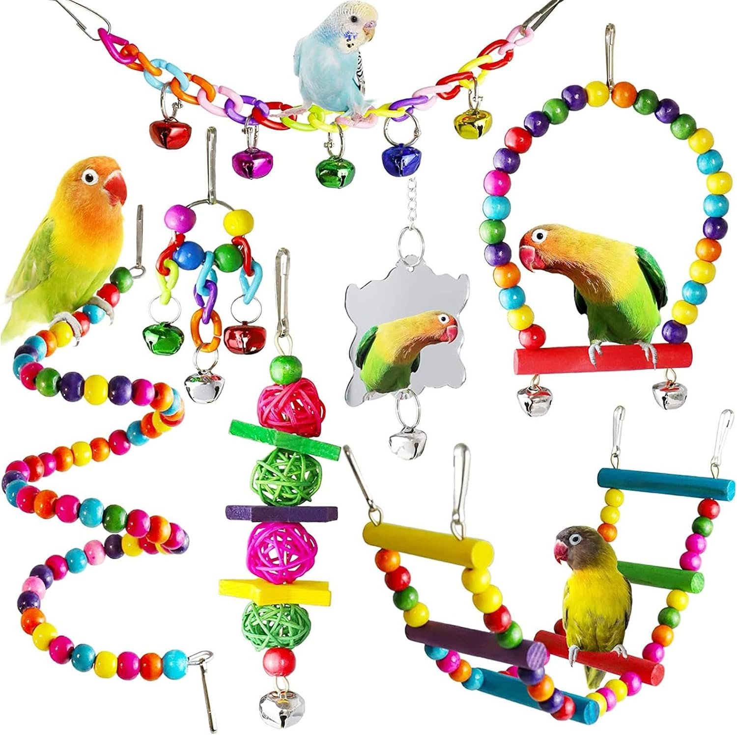 7-teiliges Vogelspielzeug: Das Set enthält 1 x Kauspielzeug, 1 x Drehleiter, 2 x Glockenspielzeug, 2 x Schaukelspielzeug für Vögel, 1 x Spiegel. Eine Vielzahl von Spielzeugen, um den Spielbedürfnissen von Papageien gerecht zu werden.