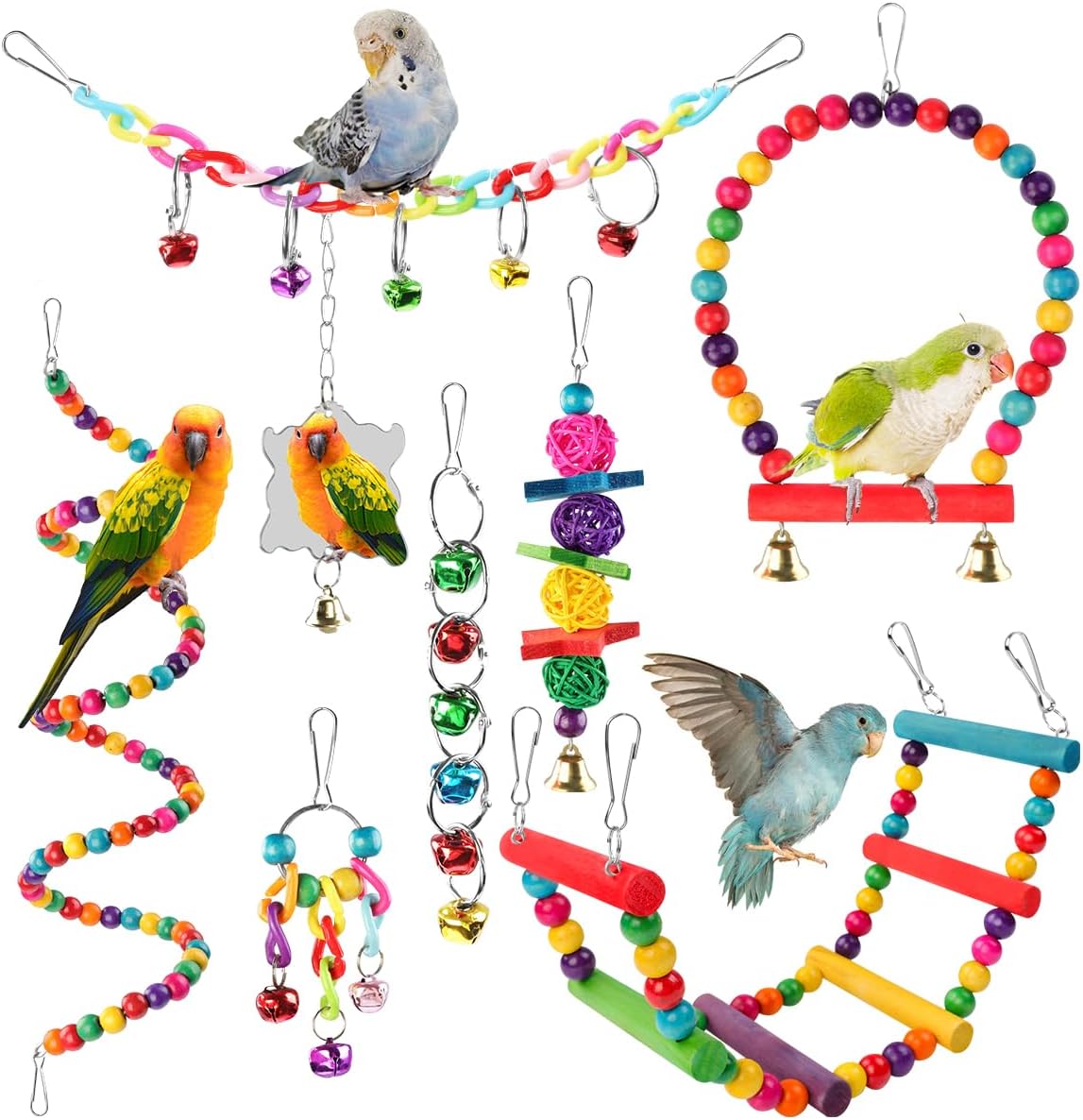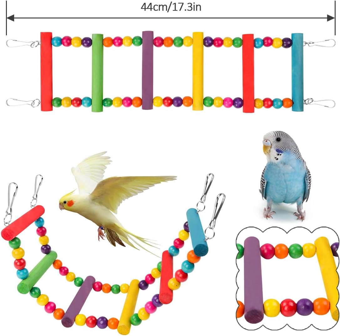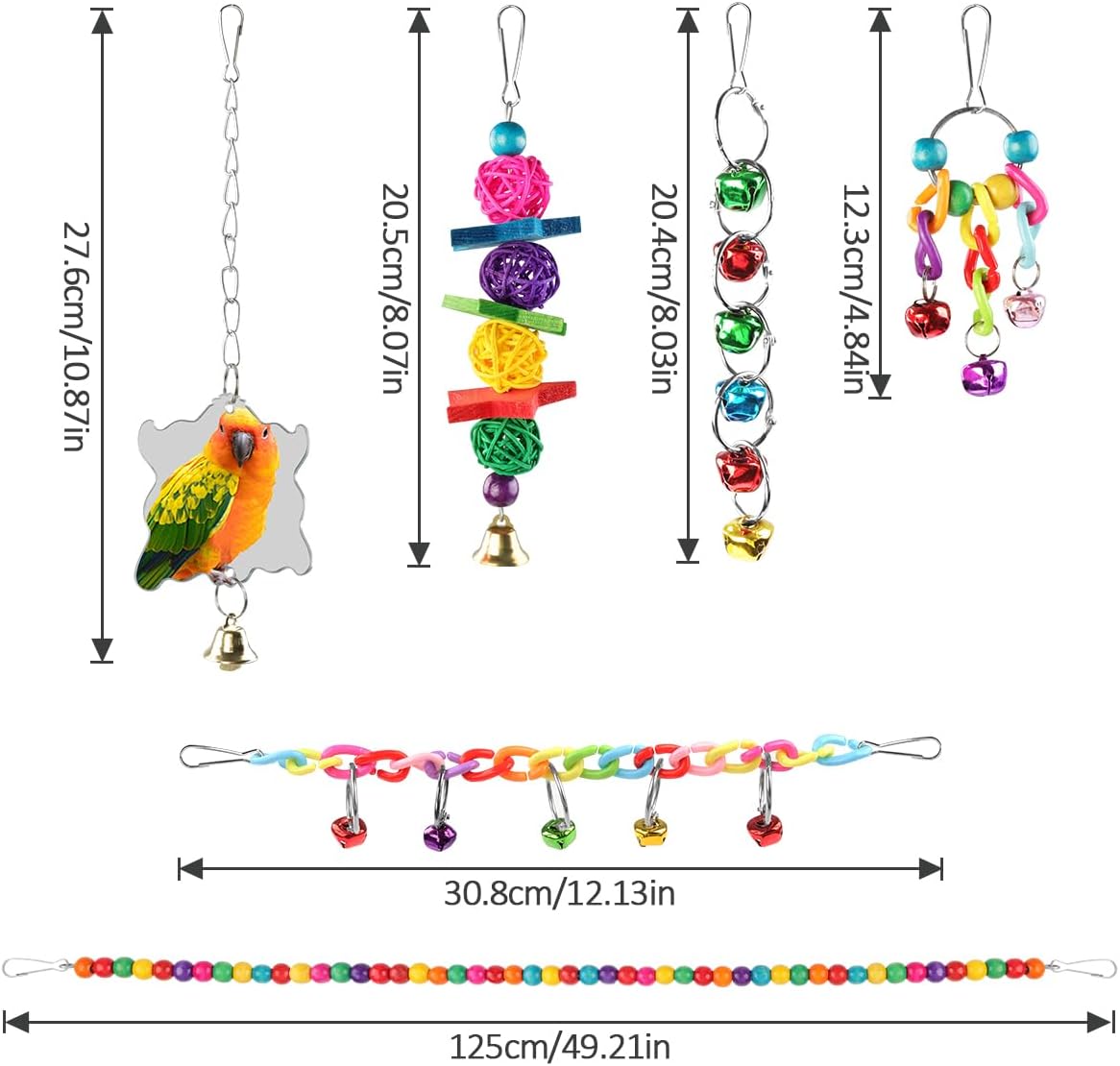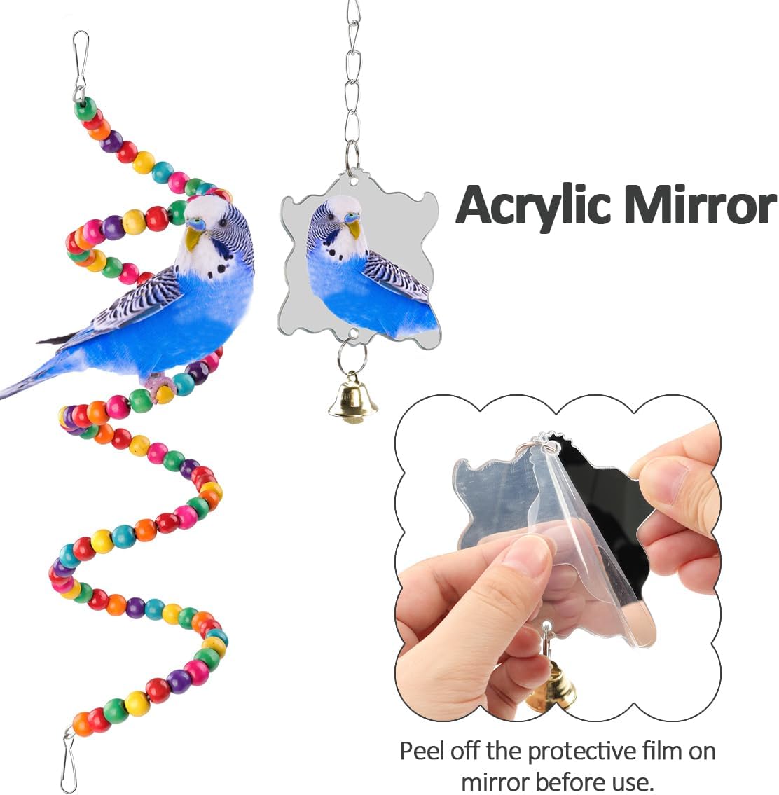 Vielseitige Spielmöglichkeiten: Dieses Vogelspielzeug-Set enthält 1 Kletterleiter, 1 Kauspielzeug, 3 Hängespielzeuge mit Glocken, 2 Vogelschaukelspielzeuge und 1 Spiegelspielzeug. Sie können weiterhin schaukeln, klettern, ziehen, kauen, nach Nahrung suchen, daran kratzen, diese Spielzeuge schütteln und von einem Spielzeug zum anderen springen.