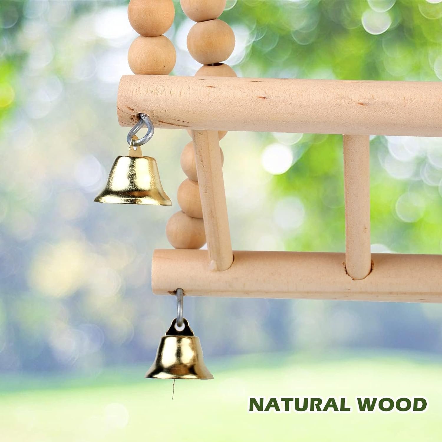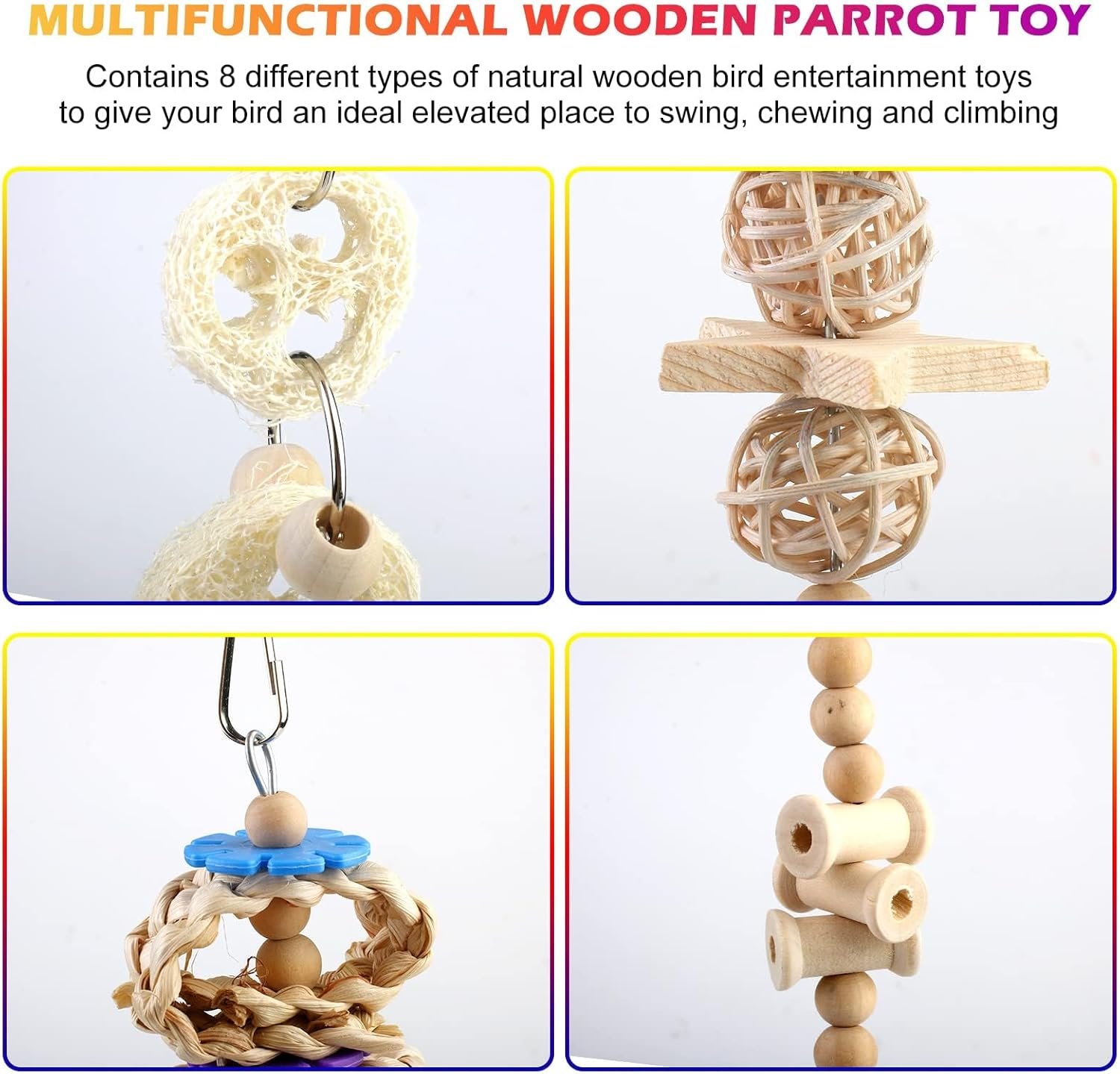 8-teiliges Set: Enthält 8 verschiedene Naturholzspielzeuge für Vögel, darunter Kauwerkzeuge, Schaukeln und Hängeglocken. Ideal für Käfig und Training.