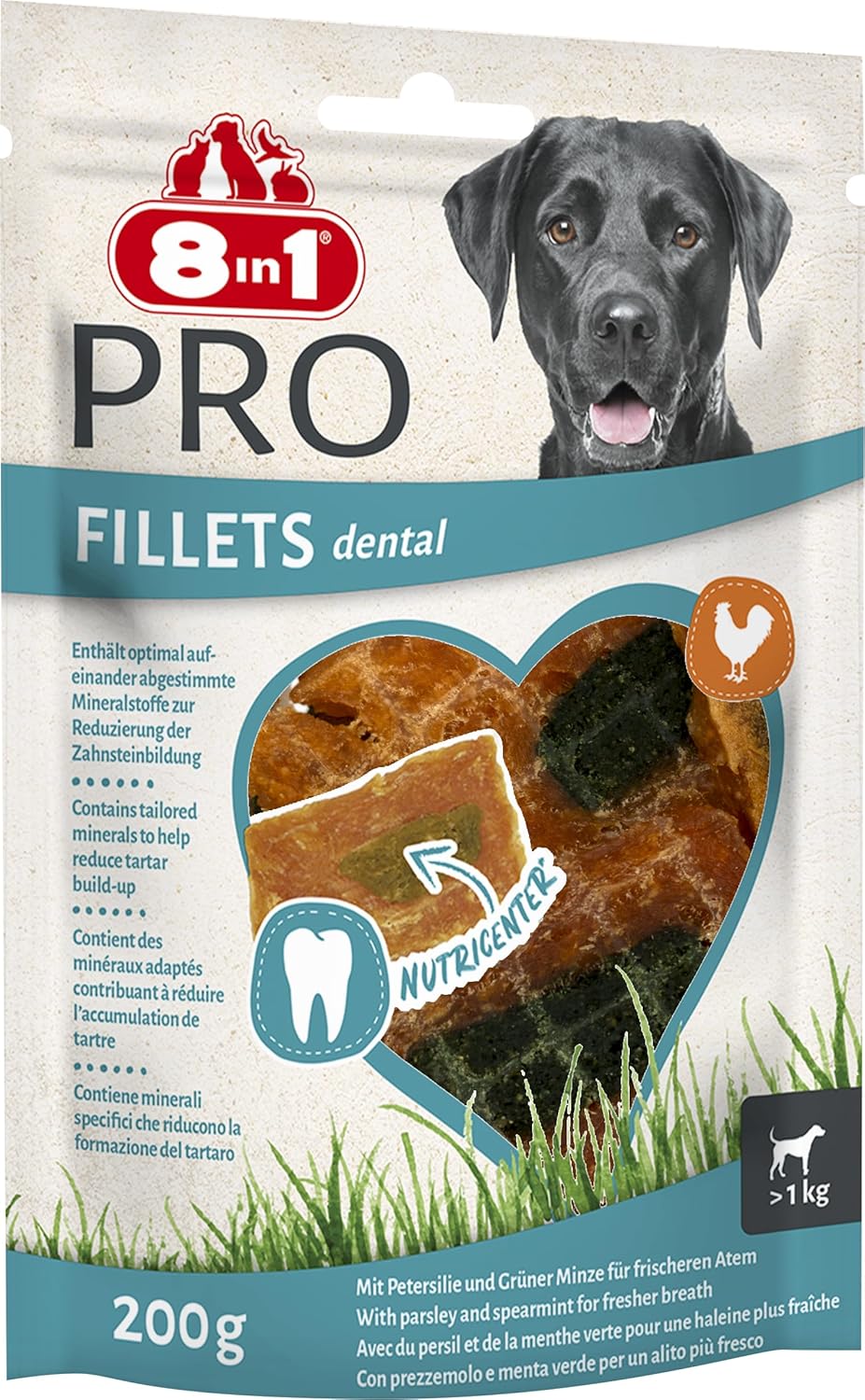 8in1 Fillets Pro Dental Leckereien sind hochwertige, leckere Snacks, die zudem für frischen Atem sorgen. 8in1 Fillets Pro Leckerlis sind nicht nur äußerst lecker und fettarm, sondern bieten Ihrem Hund auch einen besonderen Leckerbissen mit dem gewissen Extra. Diese Leckerlis werden aus köstlicher Hähnchenbrust mit einem speziellen Nährstoffkern, dem sogenannten „Nutri Center“, hergestellt, der gesunde, funktionelle Zusatzstoffe enthält, die das Wohlbefinden und die Vitalität Ihres Hundes fördern. Das einzigartige Nutri-Centre enthält speziell formulierte Mineralien zur Reduzierung von Zahnstein und ist mit Petersilie und Minze angereichert, um den Atem zu erfrischen. 8in1 Filets Pro Dental sind fettarm und proteinreich und eignen sich daher ideal als gesunde Belohnung für zwischendurch. Sie sind außerdem frei von künstlichen Farb- und Aromastoffen. Der wiederverschließbare Beutel sorgt für langanhaltende Frische und ermöglicht das bequeme Mitnehmen der Leckereien für unterwegs. 8in1 Fillets Pro sind in drei Varianten erhältlich: Pro Dental, Pro Active und Pro Skin and Coat, um den unterschiedlichen Bedürfnissen jedes Hundes gerecht zu werden.