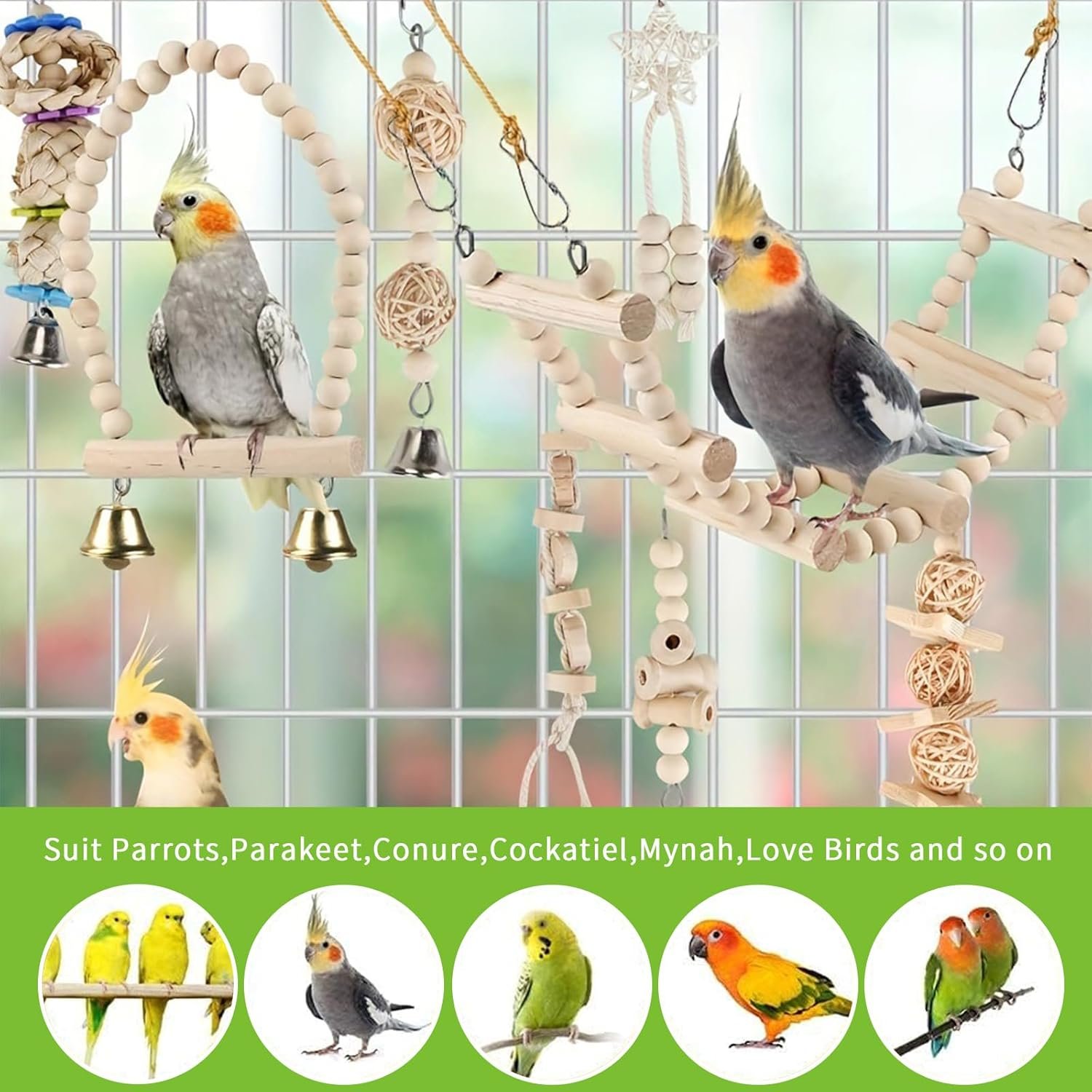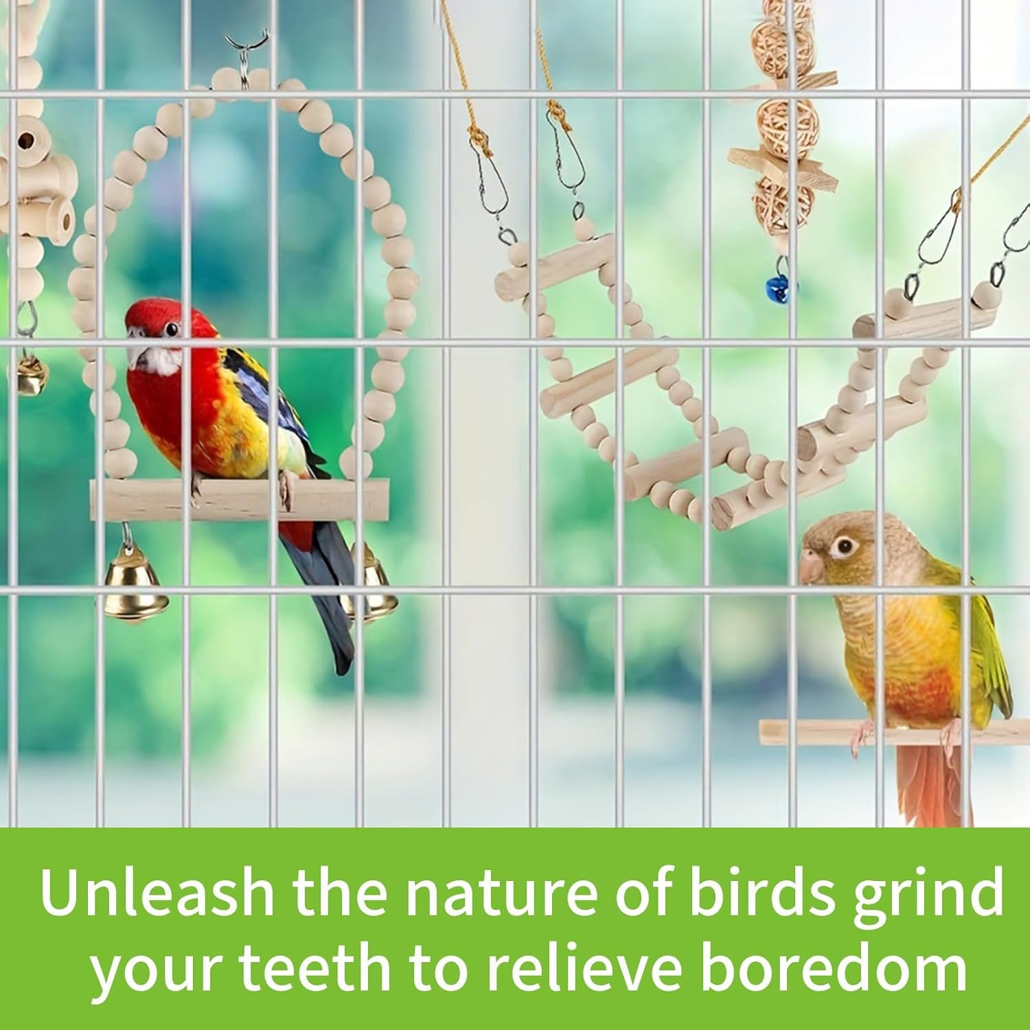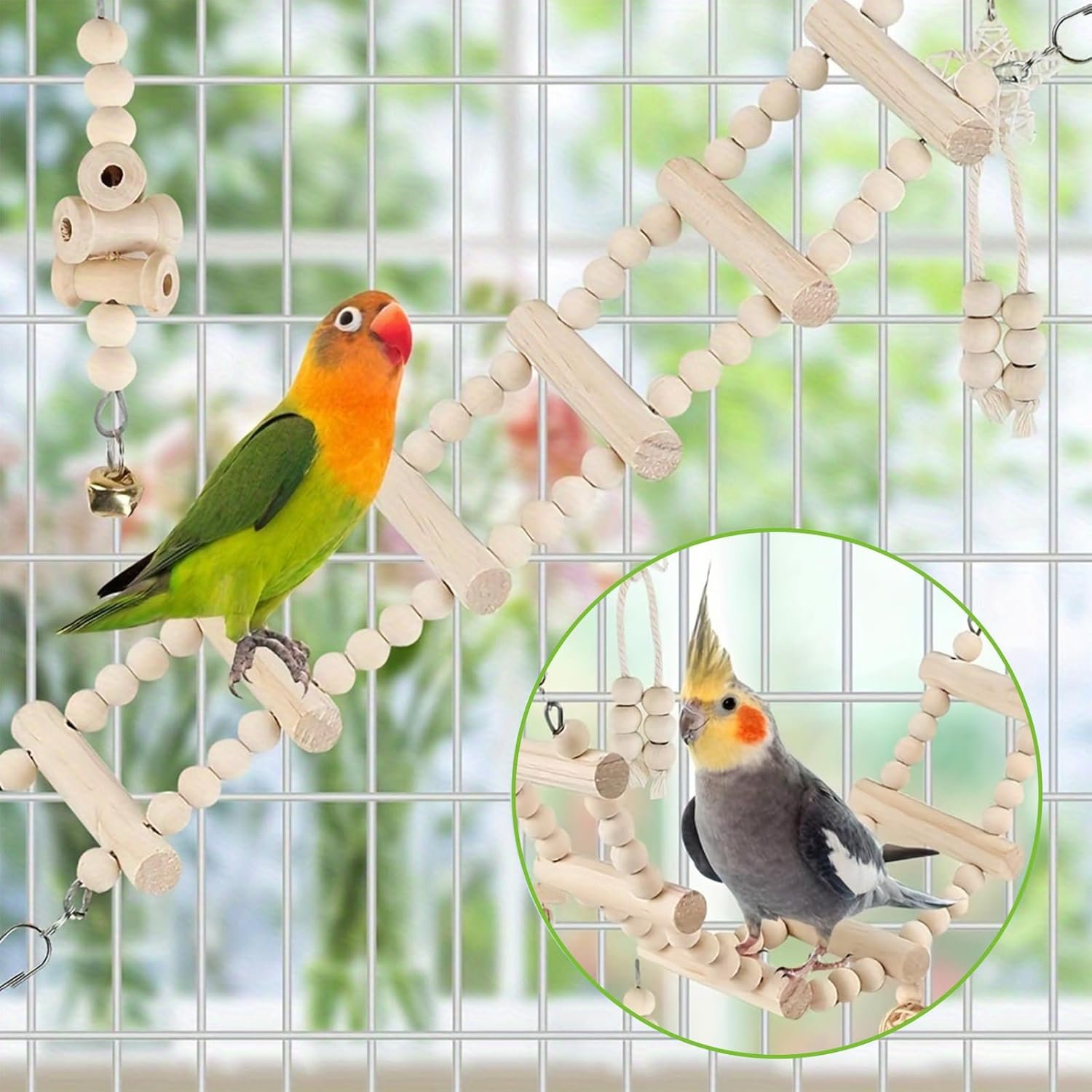 Sie können diese Vogelspielzeuge in mehreren Schichten anordnen, sodass Ihr Papagei schaukeln, klettern, kauen und die Umgebung erkunden kann.