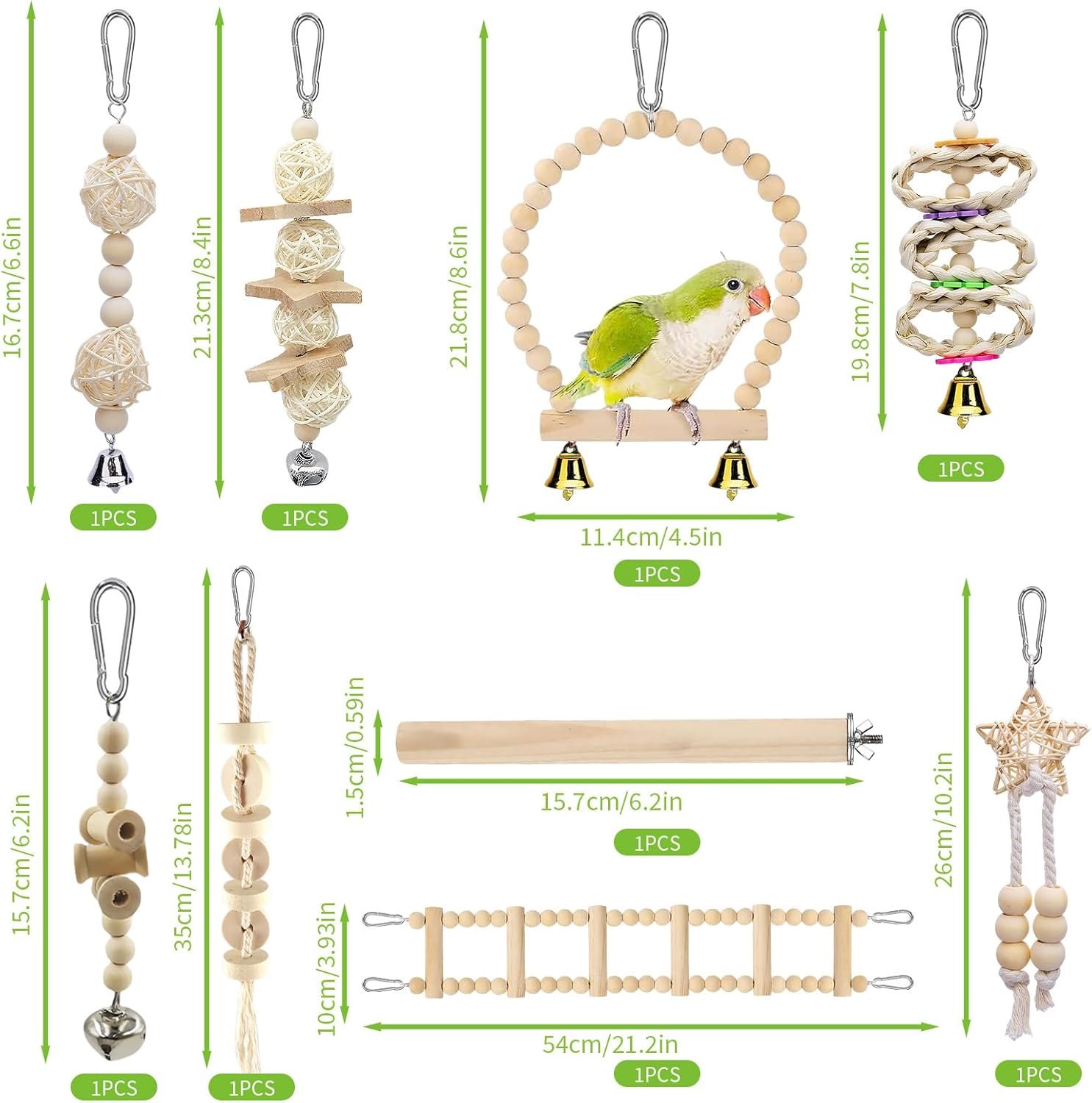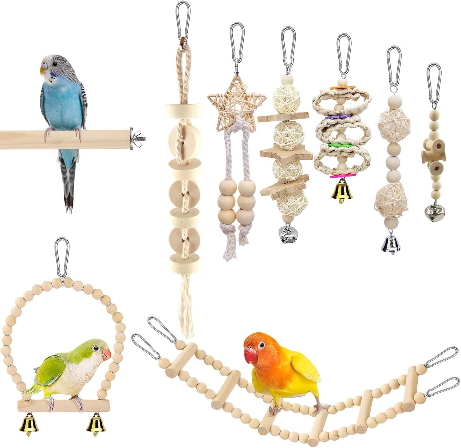 9 Stück Vogelspielzeug für Sittiche, Papageien, Vogelkäfig-Zubehör zum Aufhängen, Vogelspielzeug aus Holz, Wellensittiche, Schaukel, Papageienspielzeug, Nymphensittiche, Kauspielzeug