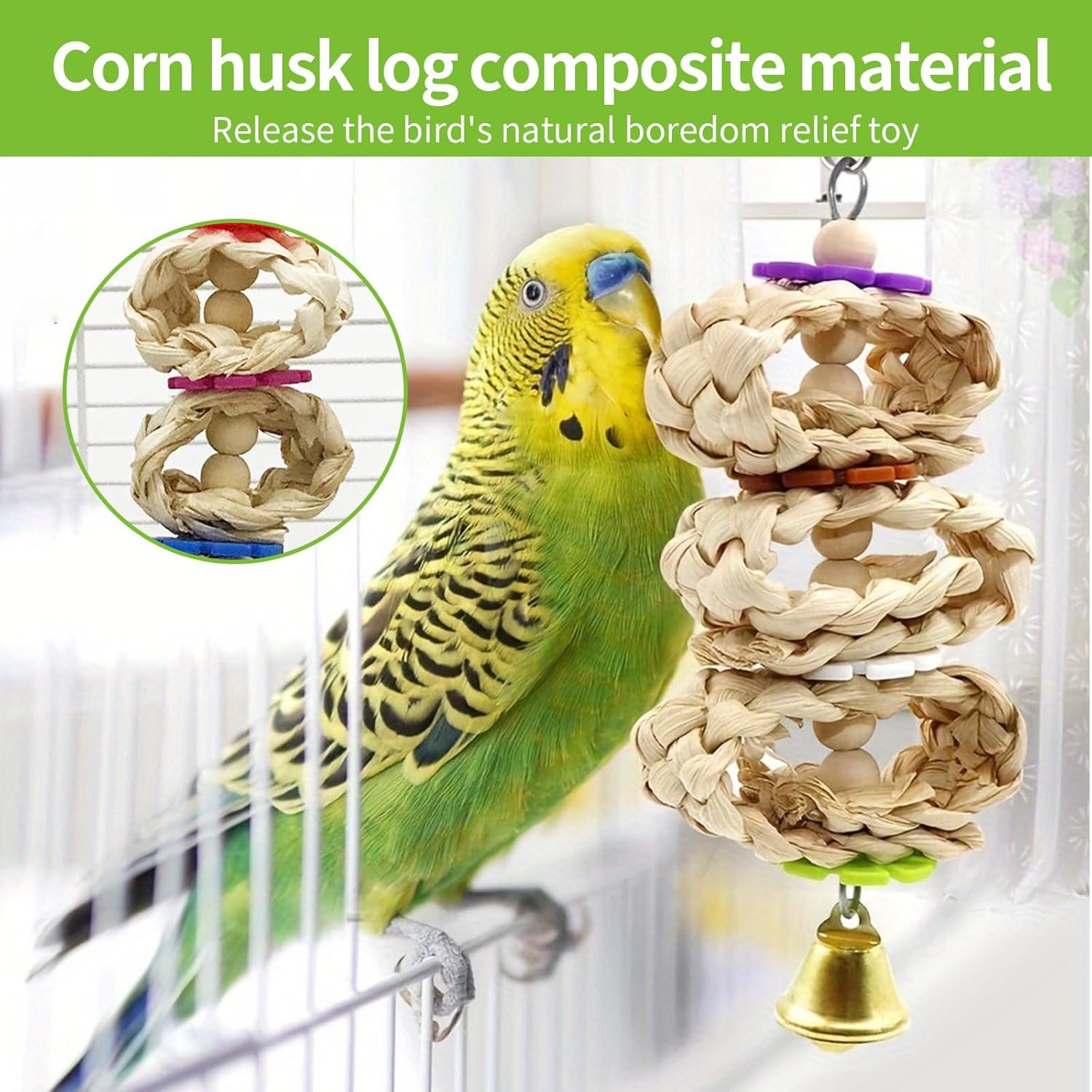 Natürliches Material: Dieses hängende Vogelkäfigzubehör für Papageien besteht aus den natürlichen, hochwertigen Materialien Holz, Rattan, Luffa und Schilf mit rostfreien Metallhaken. Es ist sicher, umweltfreundlich und geruchlos.