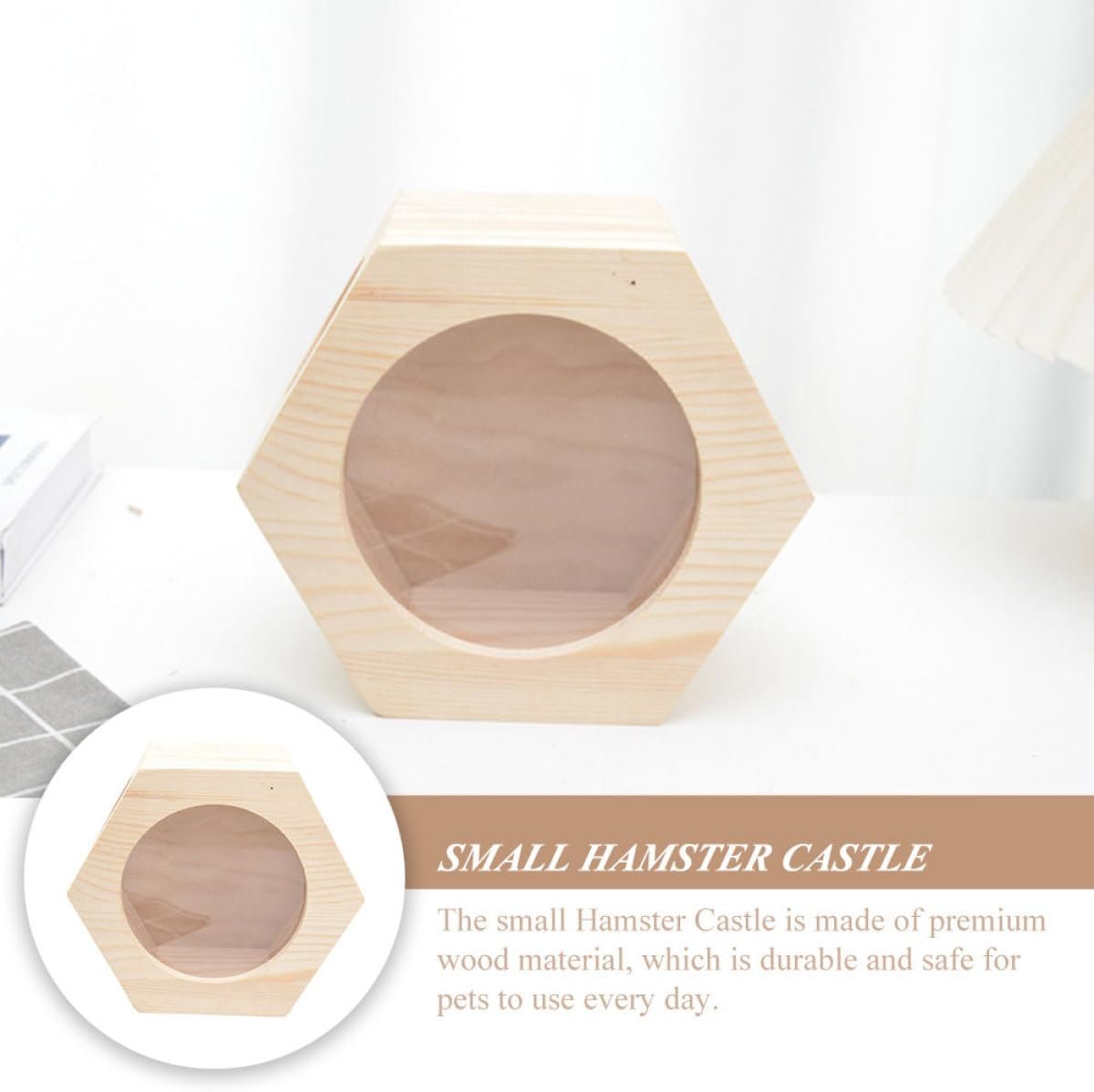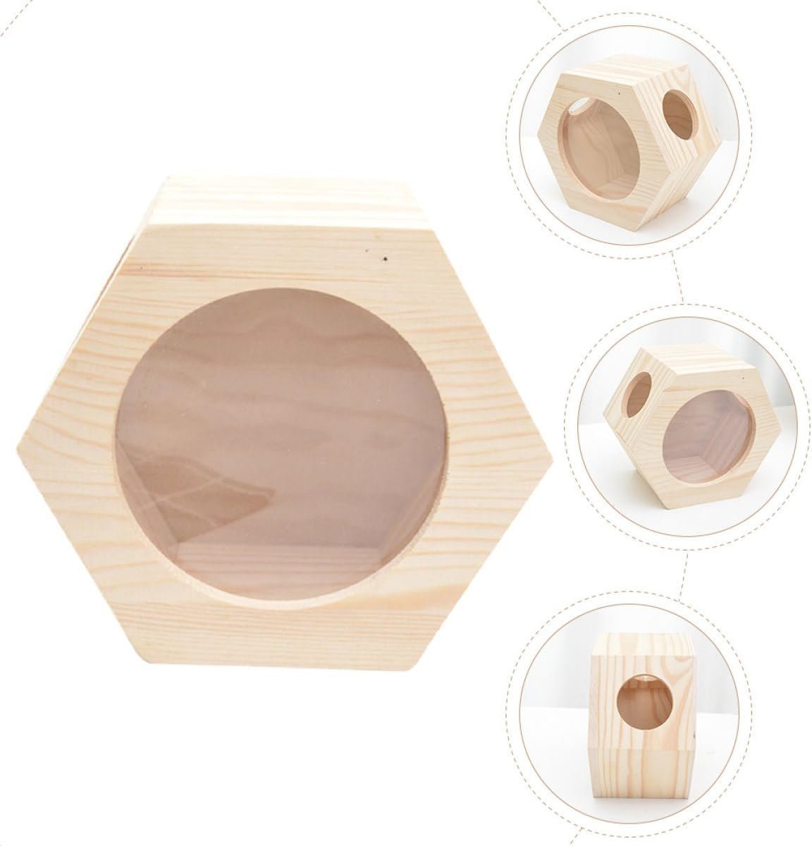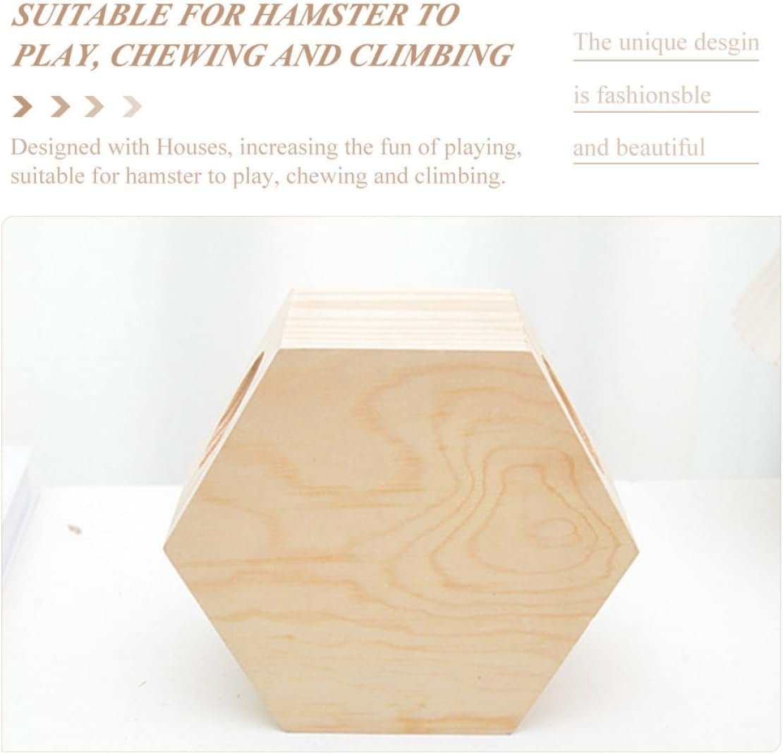 Das Hamsterhaus aus Holz unterscheidet sich von anderen Geschäften durch das Material, das für das Versteck der Tiere verwendet wird. Dieses dreidimensionale, sechseckige Hamsterhaus besteht aus einer Kombination von Kiefernholz und transparentem Acrylglas.