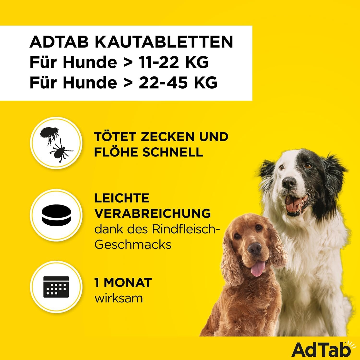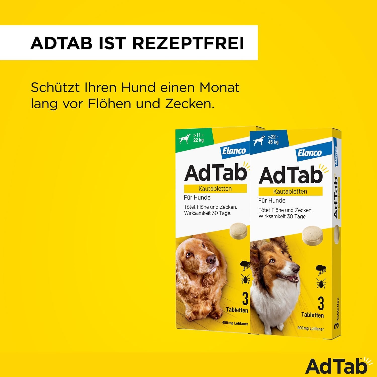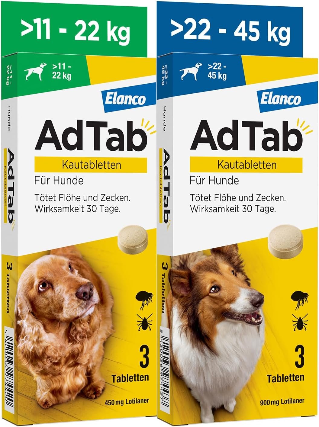 Lieferumfang: 1 Packung AdTab mit 3 Kautabletten gegen Zecken und Flöhe bei Hunden, für erwachsene Hunde und Welpen ab 8 Wochen mit einem Gewicht über 5,5 bis 11 kg und eine Packung für Hunde ab 8 Wochen mit einem Gewicht über 22 bis 45 kg.