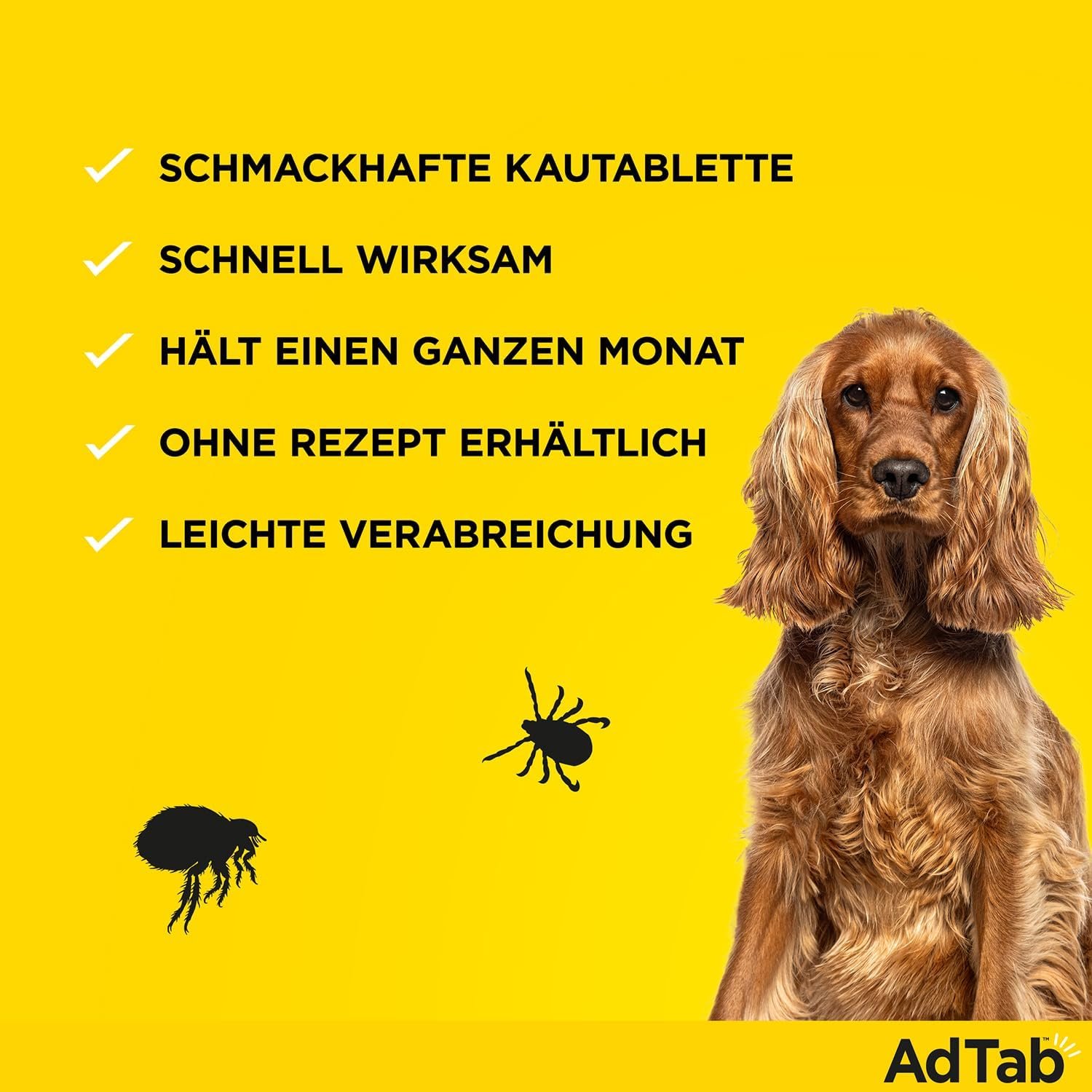 Schnelle Wirkung: AdTab Kautabletten töten Zecken und Flöhe innerhalb kurzer Zeit und schützen Ihren Hund einen ganzen Monat lang.