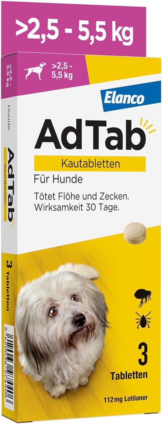 SCHNELL WIRKBAR: Die AdTab Kautablette wirkt schnell und bietet Floh- und Zeckenschutz für Hunde mit einem Gewicht von über 2,5 bis 5,5 kg für einen ganzen Monat.