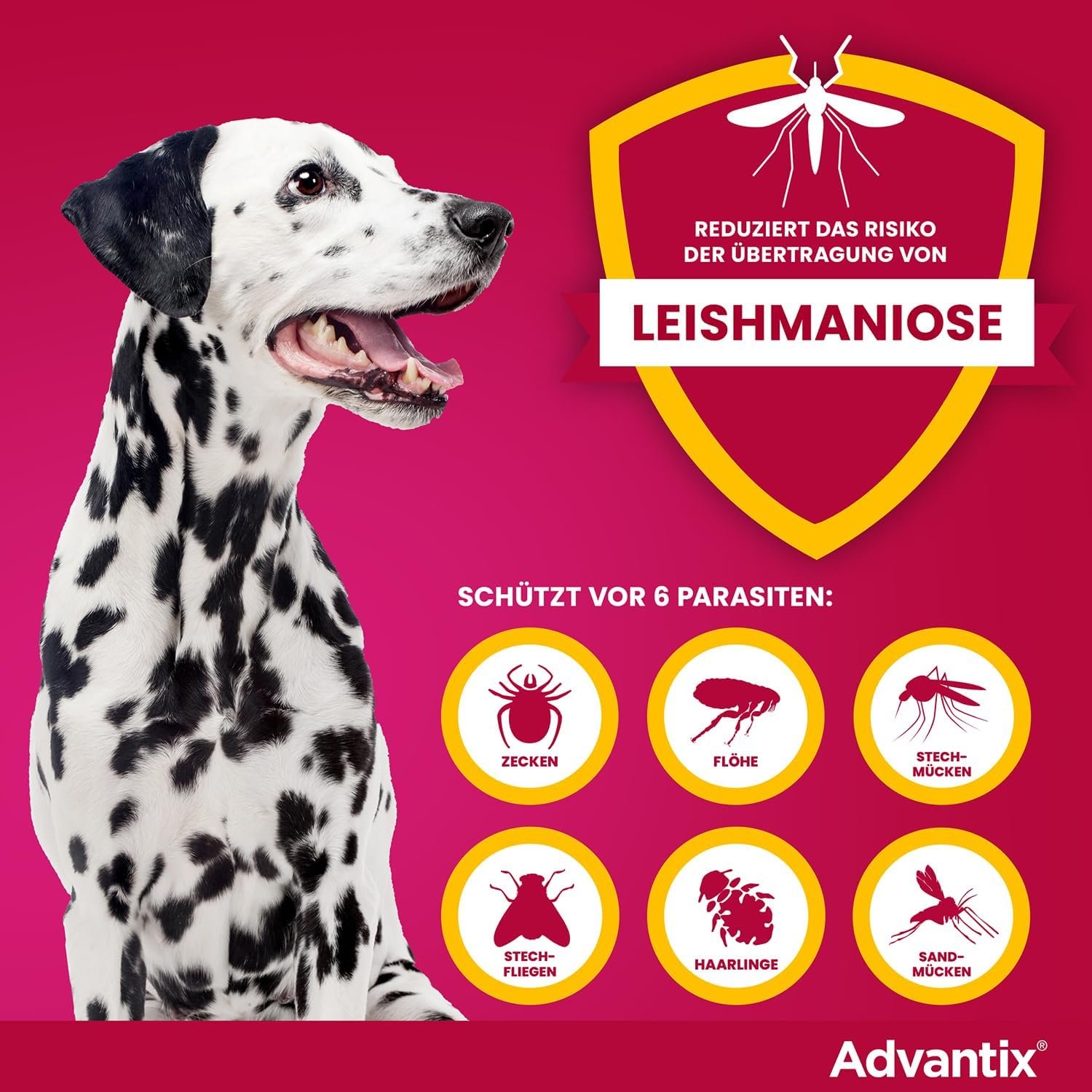 Schutz vor dem Stich: Advantix hat eine abstoßende Wirkung. Die meisten Zecken, Mücken und Sandmücken werden abgewehrt, bevor sie zustechen. Dadurch verringert sich das Risiko einer Krankheitsübertragung, etwa der Übertragung des Erregers der Leishmaniose.