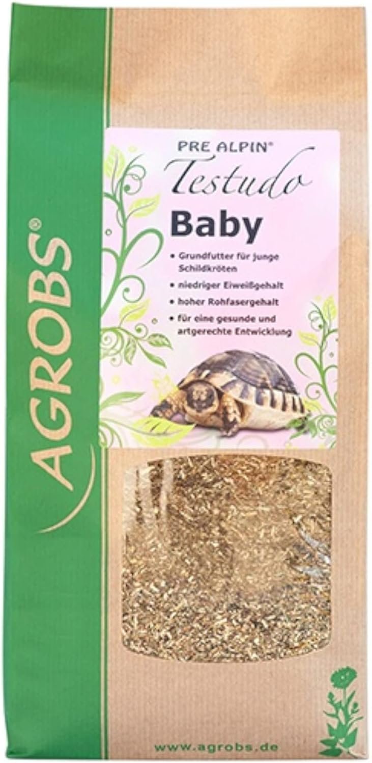 Die Ernährung wildlebender Landschildkröten hängt immer von den natürlichen Bedingungen der Vegetation ab. In ihren ursprünglichen Lebensräumen ist die eigentliche Vegetationsperiode meist auf eine kurze Zeit begrenzt, die in der Zeit vom Hochsommer bis zum Herbst durch Dürre und Hitze ersetzt wird. Im Frühjahr ist der Rohfasergehalt der Pflanzen relativ gering und der Proteingehalt hoch. Mit fortschreitendem Sommer „altern“ die Kräuter und Gräser. Daher steigt der Rohfasergehalt im Hochsommer an, wohingegen der Proteingehalt dann stark abnimmt. Um den Bedürfnissen des Organismus gerecht zu werden, sollte im saisonalen Verlauf eine angepasste Zusammensetzung der Fütterung zur Verfügung stehen. Babyschildkröten haben ähnliche Anforderungen an die Ernährung wie erwachsene Schildkröten. Sie benötigen vor allem artenreiche Kräuter und Gräser und gleichzeitig magere Wiesen. Auch wenn es schwierig ist, sollte Wert auf eine maßvolle, menschengerechte Fütterung gelegt werden. Nur so kann ein ausreichendes, langsames Wachstum des Schildkrötennachwuchses erreicht und gesundheitliche Folgeschäden vermieden werden. Testudo Baby ist ein besonders feines Futter, das auf die Ernährung junger Landschildkröten abgestimmt ist. Zutaten sind vitalstoffreiche Blätter und Samen der artenreichen Magerwiesen des bayerischen Alpenvorlandes. Dank der feinen Komponenten und der extra kurzen Faserlänge können Sie Ihre Babyschildkröten und Jungtiere bis zu einem Gewicht von 200 g mit ausreichend Ballaststoffen und Vitalstoffen versorgen. Bietet dem Jungtier eine an die natürlichen Lebensräume von Landschildkröten angepasste Ernährung, sorgt für den Aufbau und Erhalt einer gesunden Darmflora, ist frei von Geschmacks- und Konservierungsstoffen, optimiert die Nähr- und Vitalstoffversorgung und sorgt für eine optimale Rohfaserversorgung