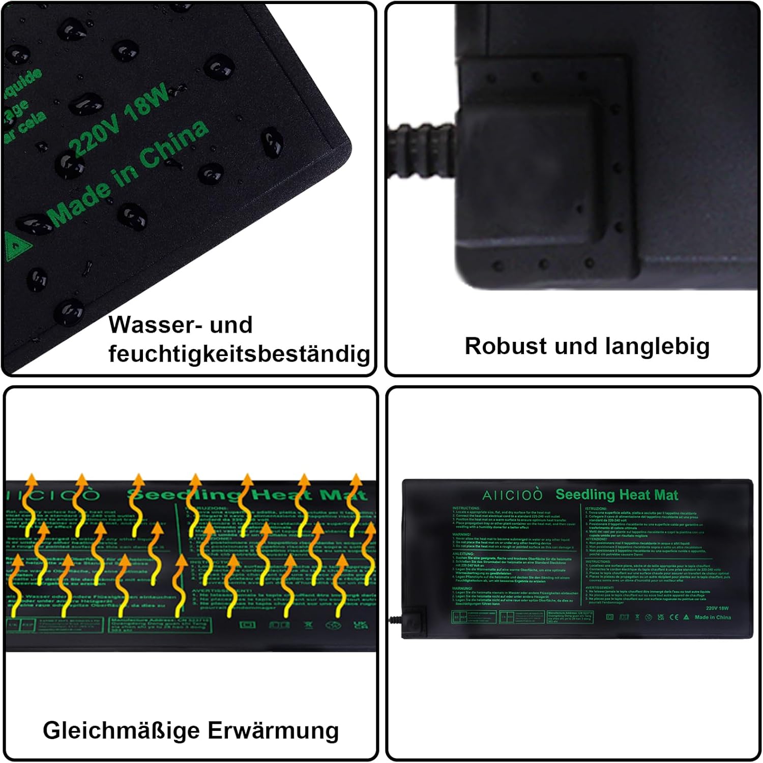 Die Pflanzenheizmatte von AIICIOO eignet sich perfekt zum Pflanzen, da sie die Pflanzschale erwärmt und eine optimale Temperatur von 20 °C bis 30 °C aufrechterhält, um die Keimung der Sämlinge zu fördern und ihre Überlebensrate zu erhöhen.