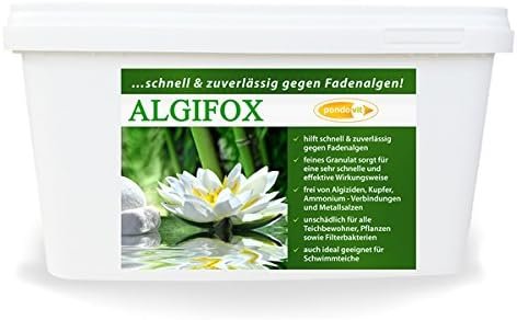 Pondovit Algifox Algenmittel 5000 g gegen Fadenalgen für 150.000 Liter Teichwasser … schnell und zuverlässig gegen Fadenalgen. Beschreibung: – Hilft effektiv und zuverlässig gegen Fadenalgen, frei von Algiziden, Kupfer, Ammoniumverbindungen und Metallsalzen. Aktiviert für alle Teichbewohner und Pflanzen unschädliche Mikroorganismen, auch für Schwimmteiche – geeignetes Feingranulat sorgt für schnelle Wirkung. Durch die besondere Zusammensetzung von Algifox werden dem Wasser überschüssige Nährstoffe entzogen, so dass die Algen keine Wachstumsgrundlage mehr haben. Gleichzeitig setzt sich der Wirkstoff in den Algen fest, wodurch diese sich nach einiger Zeit vollständig auflösen. Eine weitere Algenvermehrung wird gestoppt, da sie keine Möglichkeit mehr hat, ihre Algensporen an das Wasser abzugeben. Dosierung: Zu Beginn 3x pro Monat (alle 10 Tage), die benötigte Menge, dann 1 x pro Monat die benötigte Menge Pondovit – Algifox ist unter der BAuA-Registrierungs-Nr. registriert. N-56498-Kennzeichnung gemäß EU-Richtlinie 08/8 EG: Biozide sicher verwenden. Lesen Sie vor der Verwendung immer das Etikett und die Produktinformationen. Bei sachgemäßer Anwendung konnten keine Nebenwirkungen festgestellt werden. Vor Kindern schützen