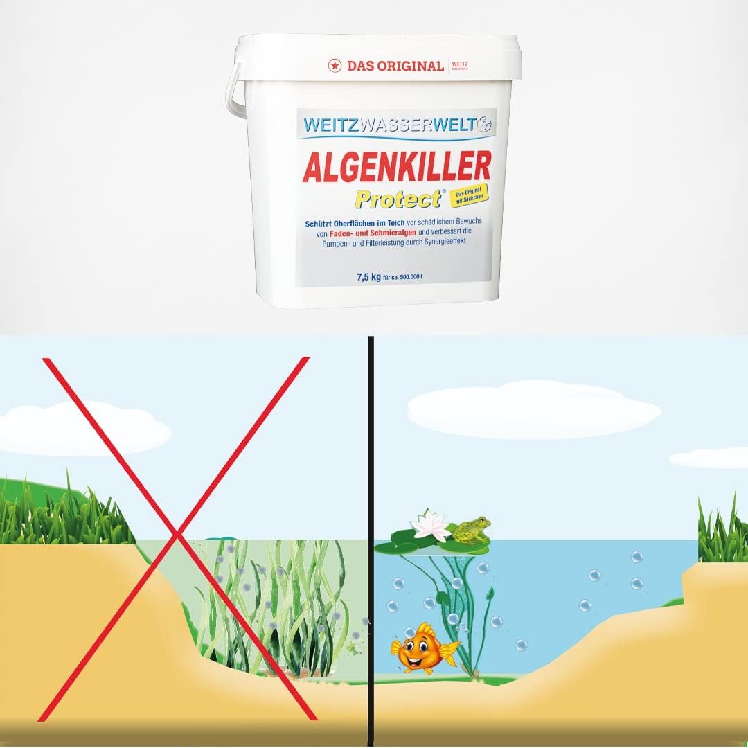 Hochwirksam gegen Algen – Algenkiller Protect zersetzt zuverlässig Fadenalgen, Schmieralgen und Grünbewuchs im Teich. Schnelle Wirkung und langanhaltender Schutz für bis zu 3 Monate. So erhalten Sie den Teich algenfrei
