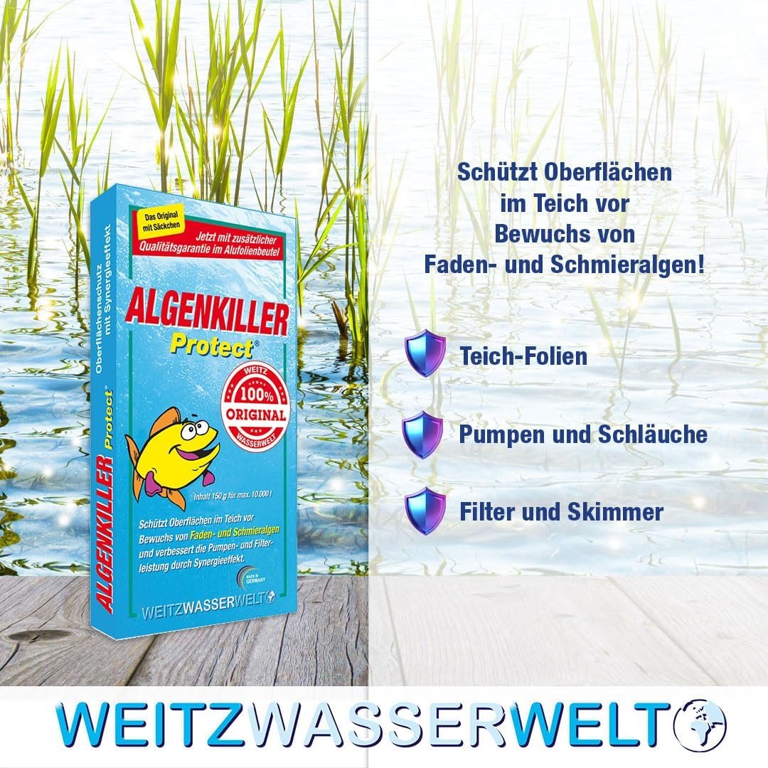 Algenvernichter schützen – mit dem speziellen Stoffbeutel Schutz vor dem Wachstum von Faden- und Schleimalgen. Optimaler Oberflächenschutz im Teich. Verbessert die Pumpen- und Filterleistung durch Synergieeffekte. Keine Schaumbildung und tausendfach bewährt. Enthält lebende, nicht gentechnisch veränderte Mikroorganismen. Algenvernichter Protect 150 g des Granulats reichen für max. 10.000 Liter Teichwasser. Entsprechende Dosierung bei anderem Teichvolumen und abhängig von der Stärke des Algenbefalls. Geben oder streuen Sie den Algenvernichter Protect entsprechend der Dosierungsanleitung in den speziellen Stoffbeutel. FÜR SIE: Qualitätsplus: Mit Algenkiller Protect erwerben Sie ein 100 % Qualitätsprodukt. GENFREI: Für den Algenvernichterschutz werden ausschließlich antitoxische Hochleistungsmikroorganismen verwendet, die frei von Gentechnik sind. Service Plus: Jeder Mitarbeiter im Algenkiller Protect Team sieht Kunden und Teichbesitzer im Mittelpunkt seiner täglichen Aufgaben. Produkt-Plus: Mit jedem einzelnen Produkt von Algenkiller Protect erwerben Sie eine erfolgreiche Wirkformel zum Schutz Ihres Teiches. RÜCKGABEVERSPRECHEN: Der Rückruf vom Algenkiller Protect Team ist für Sie kostenlos und erfolgt in der Regel innerhalb weniger Stunden. Algenkiller Protect ist ein neuartiges Kombinationsprodukt zum wirksamen und nachhaltigen Oberflächenschutz von z. B. Teichfolien, Pumpen, Schläuchen etc. gegen Faden- und Schmieralgen. Die Algen sterben ab und werden durch hochwertige, nicht gentechnisch veränderte Mikroorganismen abgebaut. Für den Algenabbau ist Sauerstoff erforderlich, sodass Fische für eine ausreichende Sauerstoffversorgung sorgen können. Schalten Sie das UV-Licht während des Gebrauchs aus. Algenvernichter Protect entsprechend der Dosierungsanleitung im speziellen Stoffbeutel verwenden oder einstreuen. Algenkiller Protect ist ein hochwertiges Produkt zum wirksamen und nachhaltigen Oberflächenschutz von z. B. Teichfolien, Pumpen, Schläuchen etc. vor schädlichem Faden- und Schmieralgenwuchs. Die Algen sterben ab und werden durch die nicht gentechnisch veränderten Hochleistungsmikroorganismen abgebaut. Inhalts- und Wirkstoffe: Enthält lebende, nicht gentechnisch veränderte Mikroorganismen (6 x 109; Risiko UBA 24820003), Silizium, Zeolith, Kalzium, Magnesium usw. Terbutryn (2 mg/g), Monolinuron (3 mg/g). BAuA-Reg.-Nr. N-69763 Außerhalb der Reichweite von Kindern aufbewahren. Chargennummer und Haltbarkeit: Informationen zum Oberflächenschutz im Wasser finden Sie unter Foliendruck-Algizid. Gehen Sie vorsichtig mit Bioziden um. Lesen Sie vor der Verwendung immer das Etikett und die Produktinformationen. Unabhängige Prüfungen durch: SGS Institute Fresenius & CYTOX biologische Sicherheitstests.