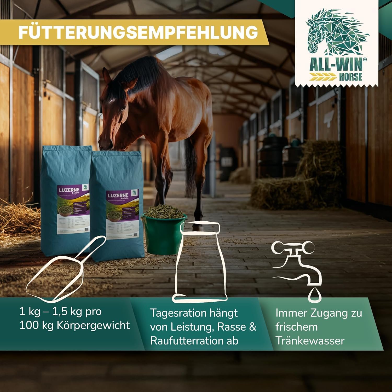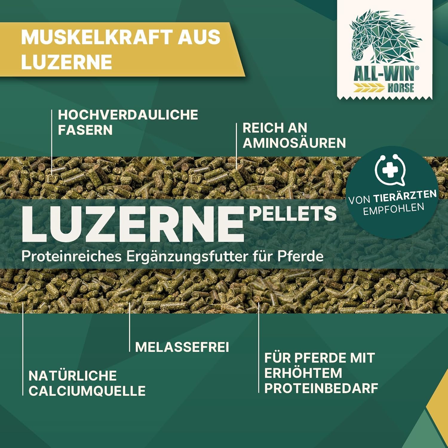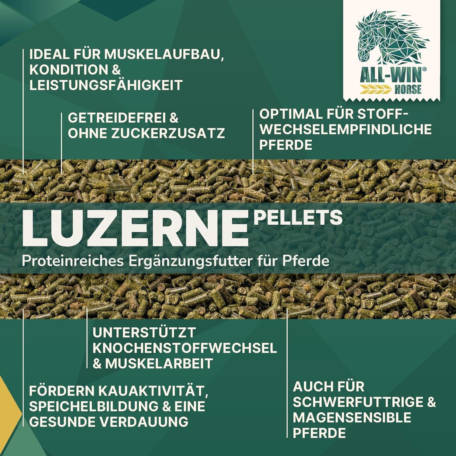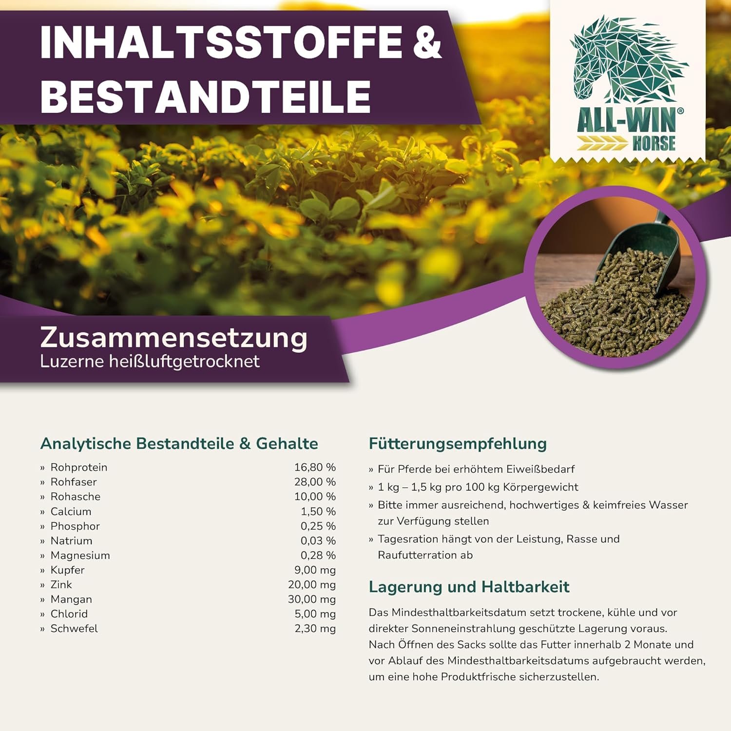 Getreidefrei und ohne Zuckerzusatz – Besonders geeignet für stoffwechselempfindliche Pferde (EMS, PSSM, Cushing), Freizeitpferde und magenempfindliche Pferde – reine Luzerne, ohne Zusatzstoffe.