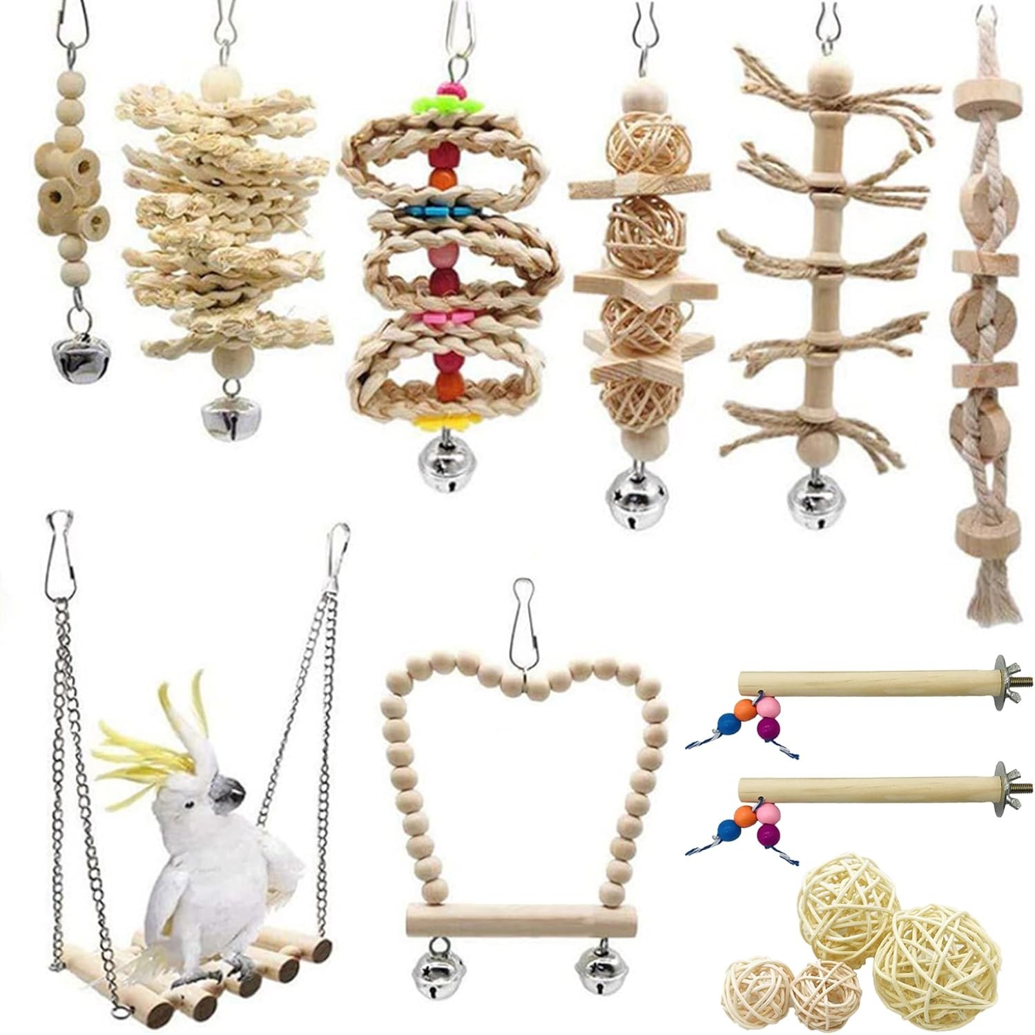 Das Paket enthält 14 verschiedene Vogelspielzeuge für Kinder, Perlenschaukel, Glockenspielzeug, Standstangenspielzeug, gewebtes Kauspielzeug zum Aufhängen von Maisschalen und Sepak-Takraw-Spielzeug, um den Bedürfnissen Ihres Liebesvogels gerecht zu werden.
