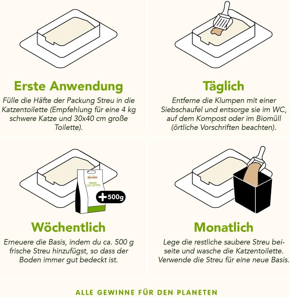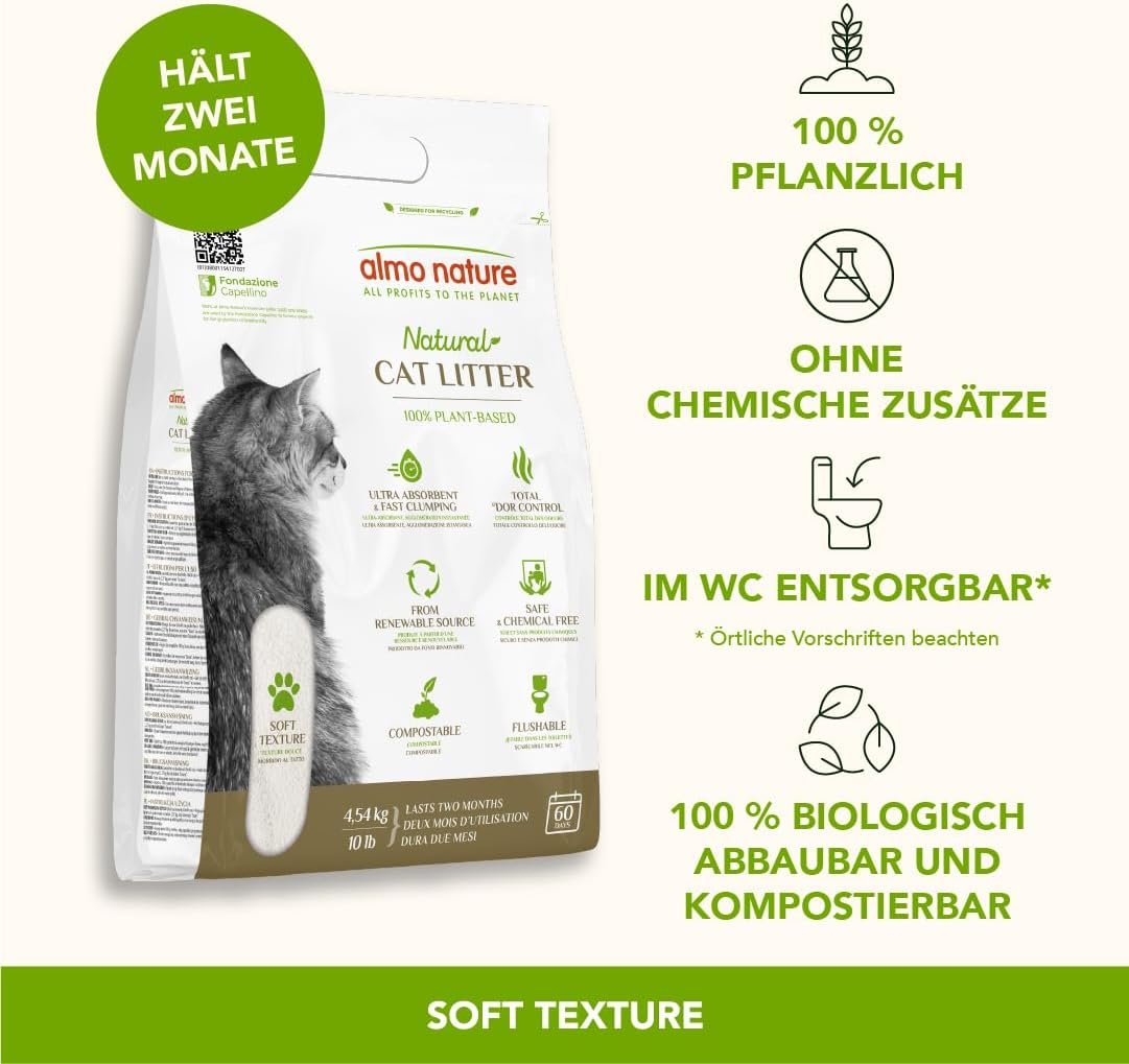Almo Nature CatLitter ist eine völlig natürliche Katzenstreu auf Pflanzenfaserbasis, die biologisch abbaubar, kompostierbar und in der Toilette entsorgbar ist. Die in den Pflanzenfasern enthaltene Stärke bindet schnell, während die Enzyme unangenehme Gerüche neutralisieren. Die Katzenstreu ist staubfrei, enthält keine Kieselsäure und keine synthetischen Chemikalien und ist frei von Bentonit. Durch die geballte Kraft der Pflanzenfasern sorgt es für eine hervorragende Geruchskontrolle, eine extrem schnelle Klumpenbildung und hält die Katzentoilette und die restliche Einstreu sauber. Nachdem eine Basisschicht gefüllt ist, benötigen Sie nur noch 500 g Katzenstreu pro Woche (geschätzt für eine 4 kg schwere Katze in einer 30 cm x 40 cm großen Katzentoilette). Lassen Sie Ihre Katze es ausprobieren: Sie werden beide begeistert sein. Beachten Sie stets die örtlichen Vorschriften. Werfen Sie niemals den gesamten Inhalt der Katzentoilette in die Toilette, sondern nur die festen Klumpen. Almo Nature CatLitter ist eine völlig natürliche Katzenstreu auf Pflanzenfaserbasis, die biologisch abbaubar, kompostierbar und in der Toilette entsorgbar ist. Absorbiert und hält sauber: Die Flüssigkeit verbindet sich zu einer festen Masse, die an der Oberfläche eingeschlossen wird. Dadurch bleiben die Katzentoilette und die restliche Streu sauber. Beseitigt den Geruch: Der Urin wird sofort komprimiert und neutralisiert so die Ausbreitung schlechter Gerüche. 100 % biologisch abbaubar, sorgt für eine umweltfreundliche Entsorgung. Almo Nature ist die Marke, die durch die Projekte der Fondazione Capellino 100 % ihrer Gewinne an Katzen, Hunde und die Artenvielfalt zurückgibt.