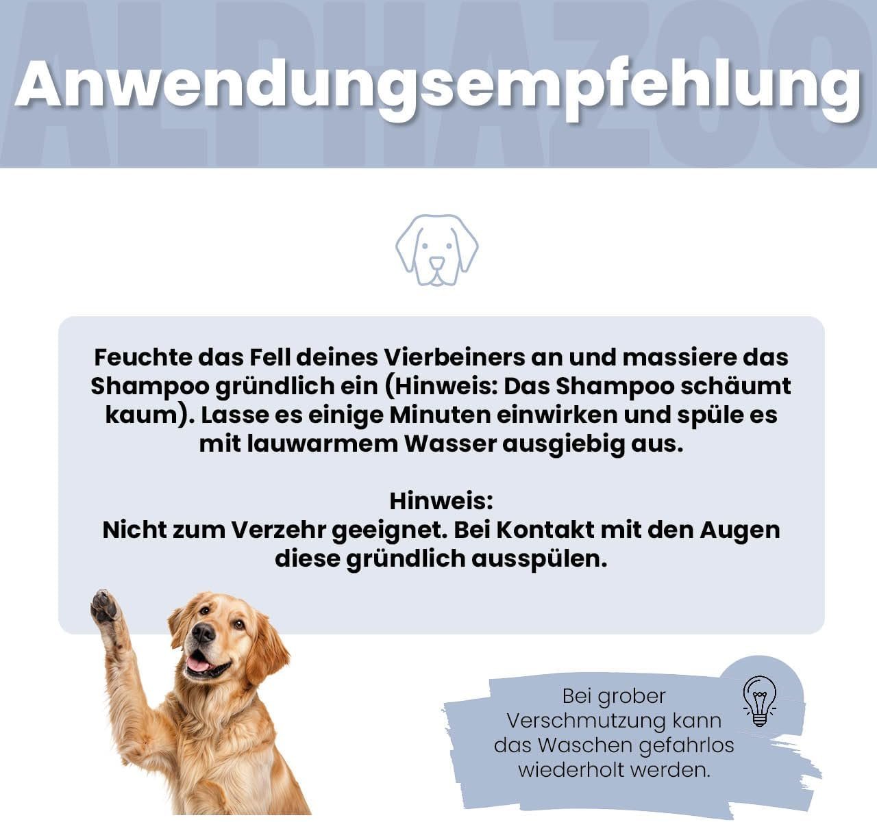 Das Fell mit lauwarmem Wasser anfeuchten, eine kleine Menge Shampoo einmassieren und 3–5 Minuten einwirken lassen. Anschließend gründlich ausspülen. Augen und Schleimhäute sollten dabei ausgespart werden.