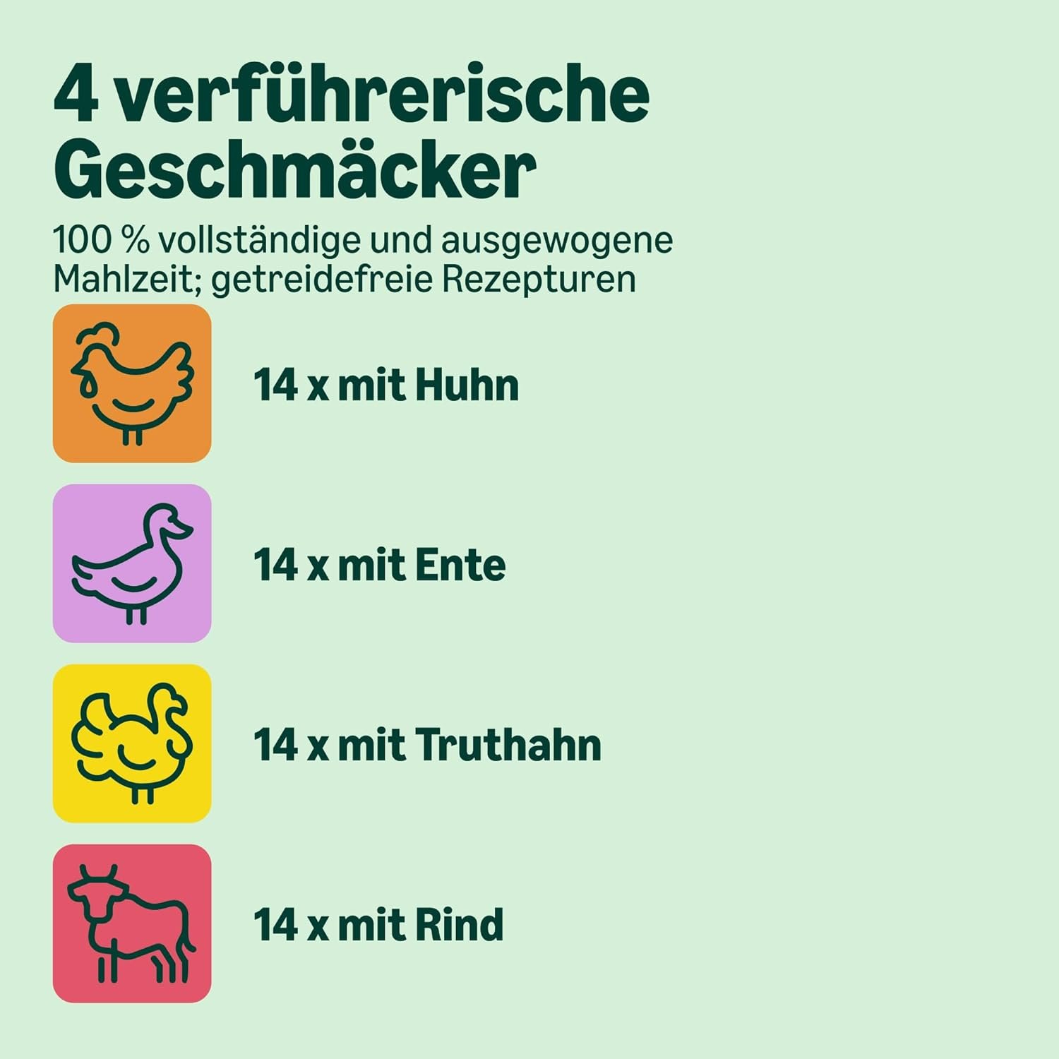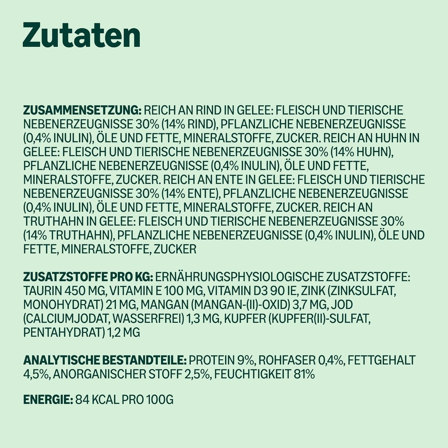Sanft gedünstete Filets, 4 köstliche Sorten: 14 x Beutel reich an Huhn in Gelee, 14 x Beutel reich an Pute in Gelee, 14 x Beutel reich an Rindfleisch in Gelee, 14 x Beutel reich an Ente in Gelee.