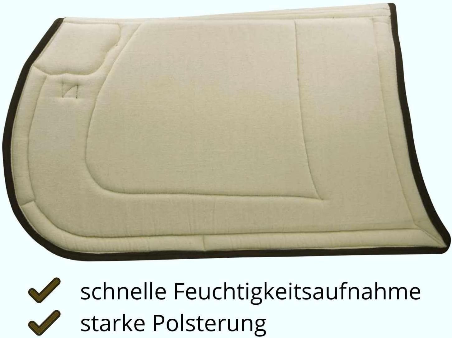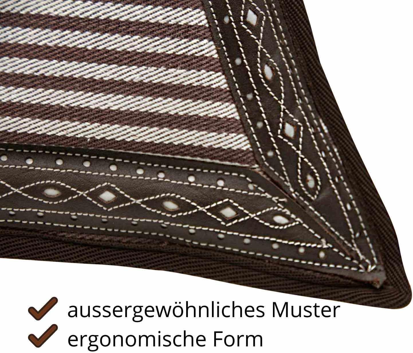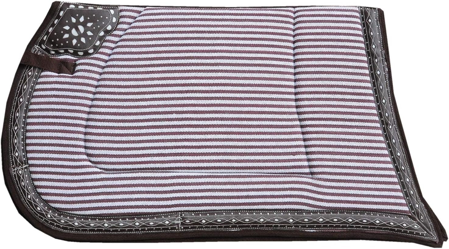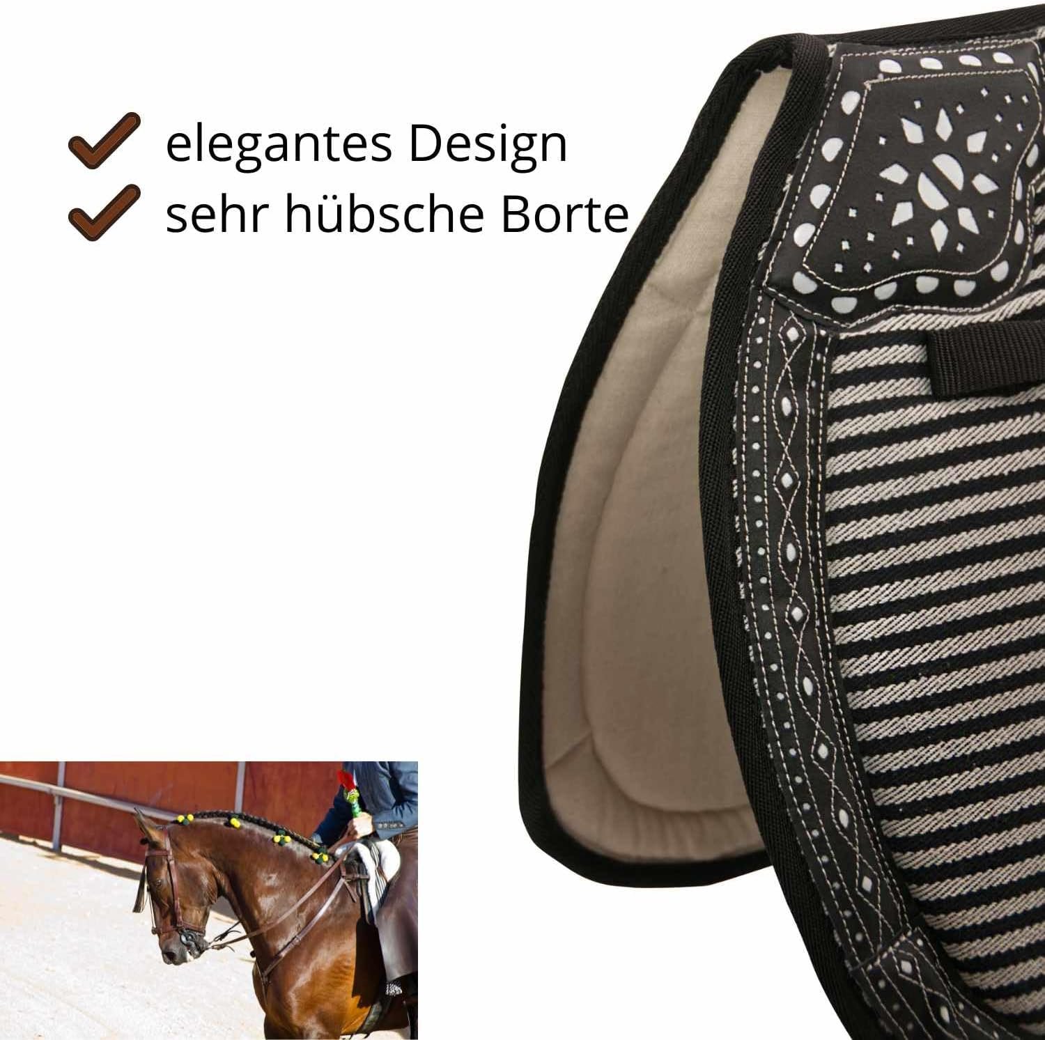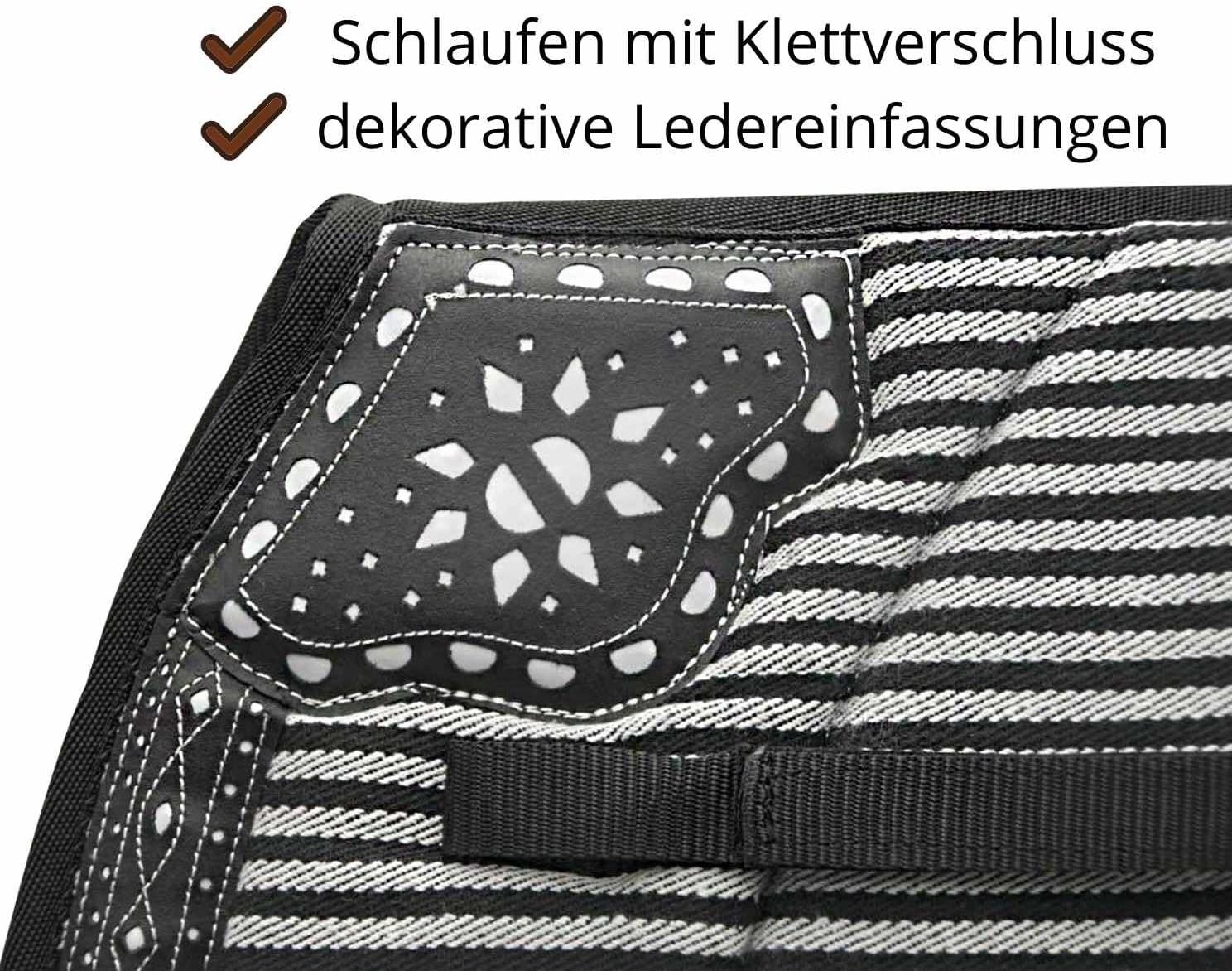 Spanische Schabracke REPUKHARA aus zweifarbiger Baumwolle. Mit ca. 2 cm dicker Schaumstoff gepolstert. Die Unterseite besteht aus biegbarem Baumwollfutter. Am Widerrist und entlang der Schabracke mit einer schönen Ledereinfassung verziert. 2 Befestigungslaschen Maße: Rückenlänge: 60 cm, Seitenlänge (gemessen von der Mitte nach unten): 47 cm 00589