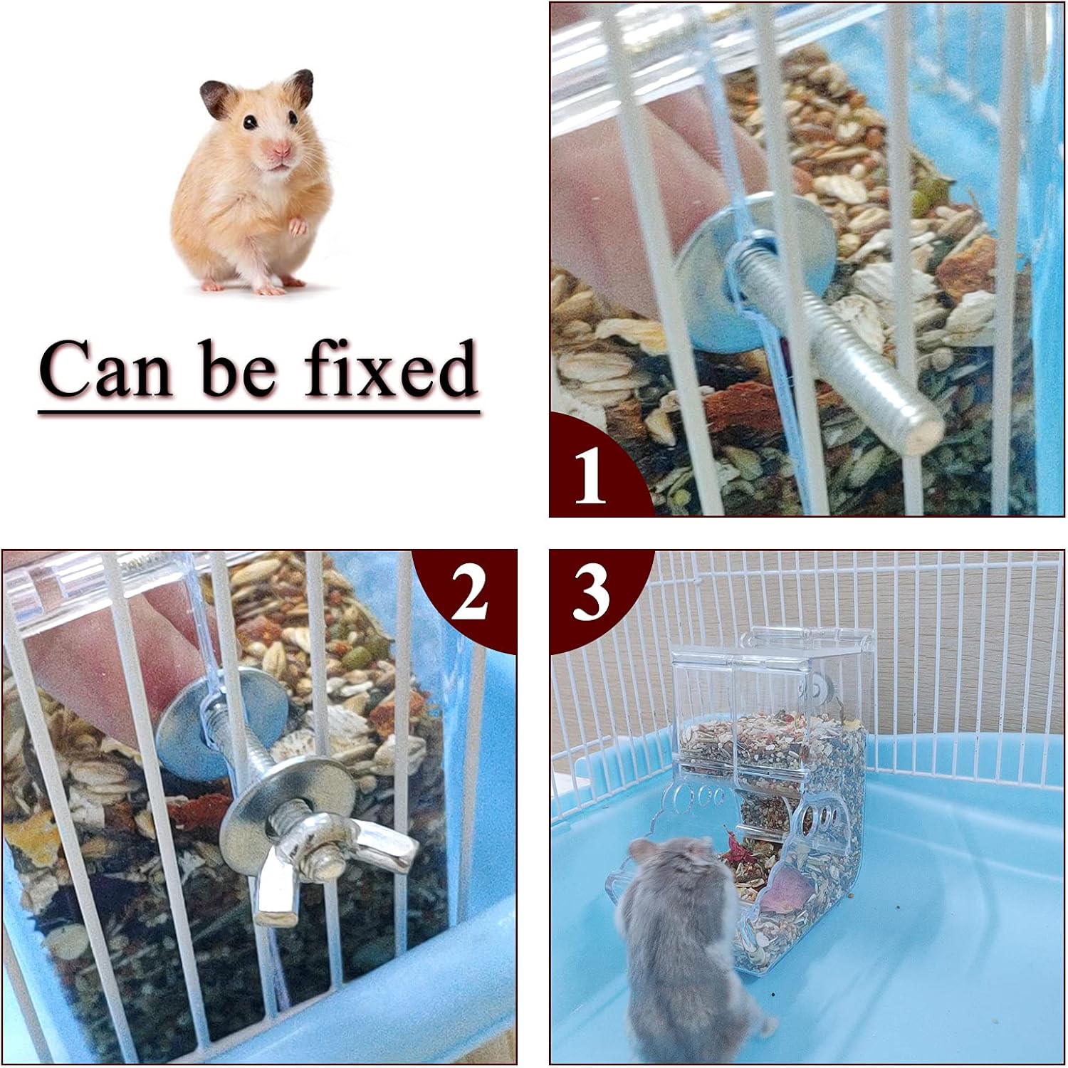 Zwei Verwendungsmöglichkeiten: n sind im Lieferumfang enthalten. Auf der Rückseite des Futterautomaten befinden sich Löcher, mit denen Sie den Futterautomaten am Hamsterkäfig befestigen können. Sie können es auch direkt auf den Boden stellen, um Ihre Hamster zu füttern.