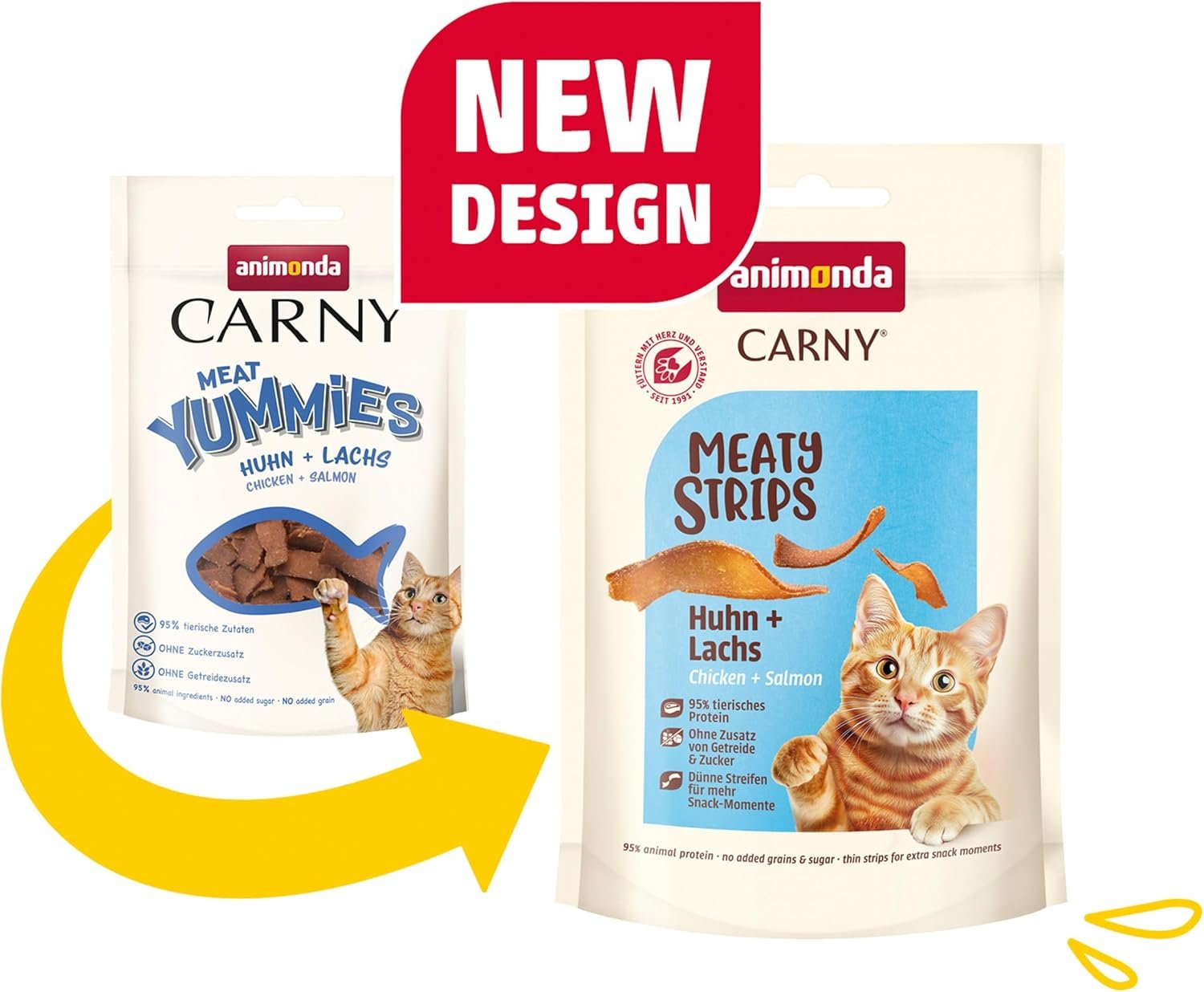 Hochwertige Leckerbissen: Unsere Carny Meat Streifen mit Huhn und Rind sind weiche Katzensnacks mit einem Proteingehalt von 96 % und ohne Zusatz von Getreide und Zucker.