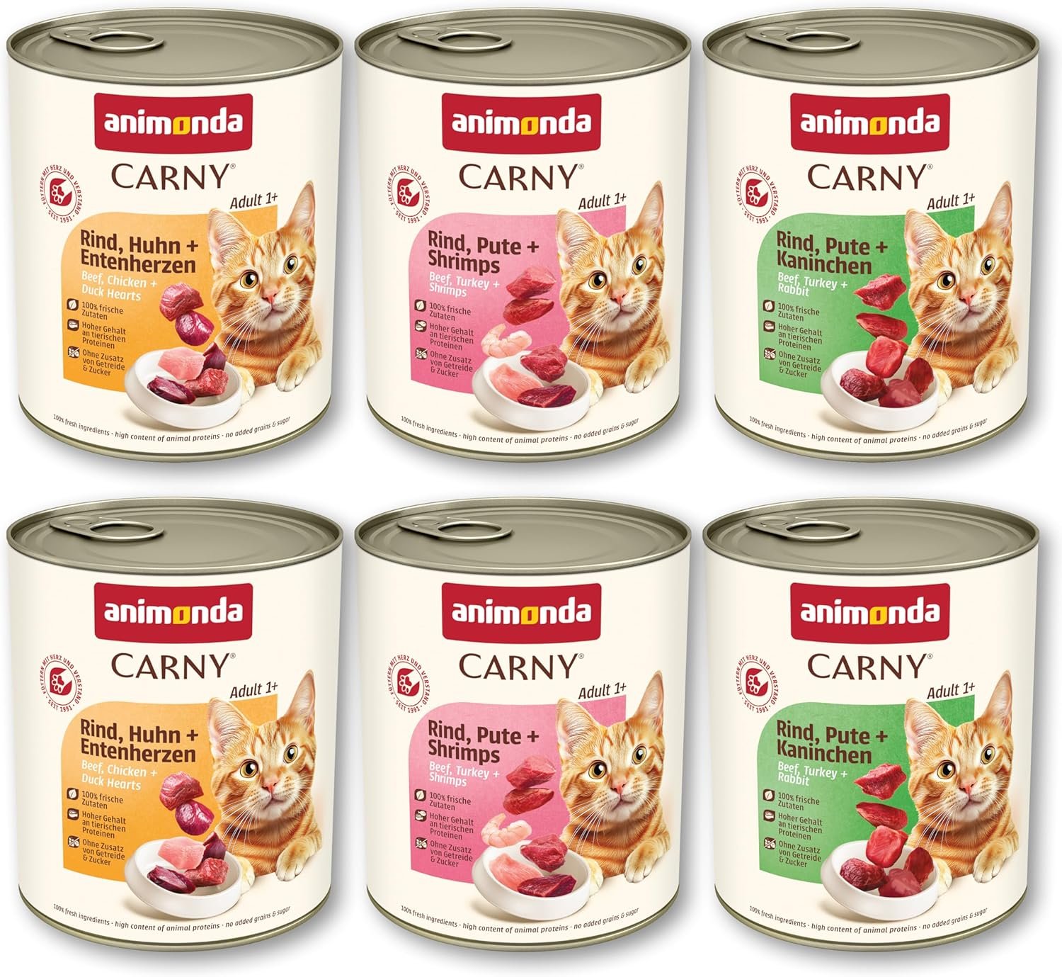 Praktischer Lieferumfang: animonda Carny Adult Strong Variation, bestehend aus 2 x Rind, Huhn + Entenherzen, 2 x Rind, Truthahn + Garnelen, 2 x Rind, Truthahn + Kaninchen, 6 x 800 g