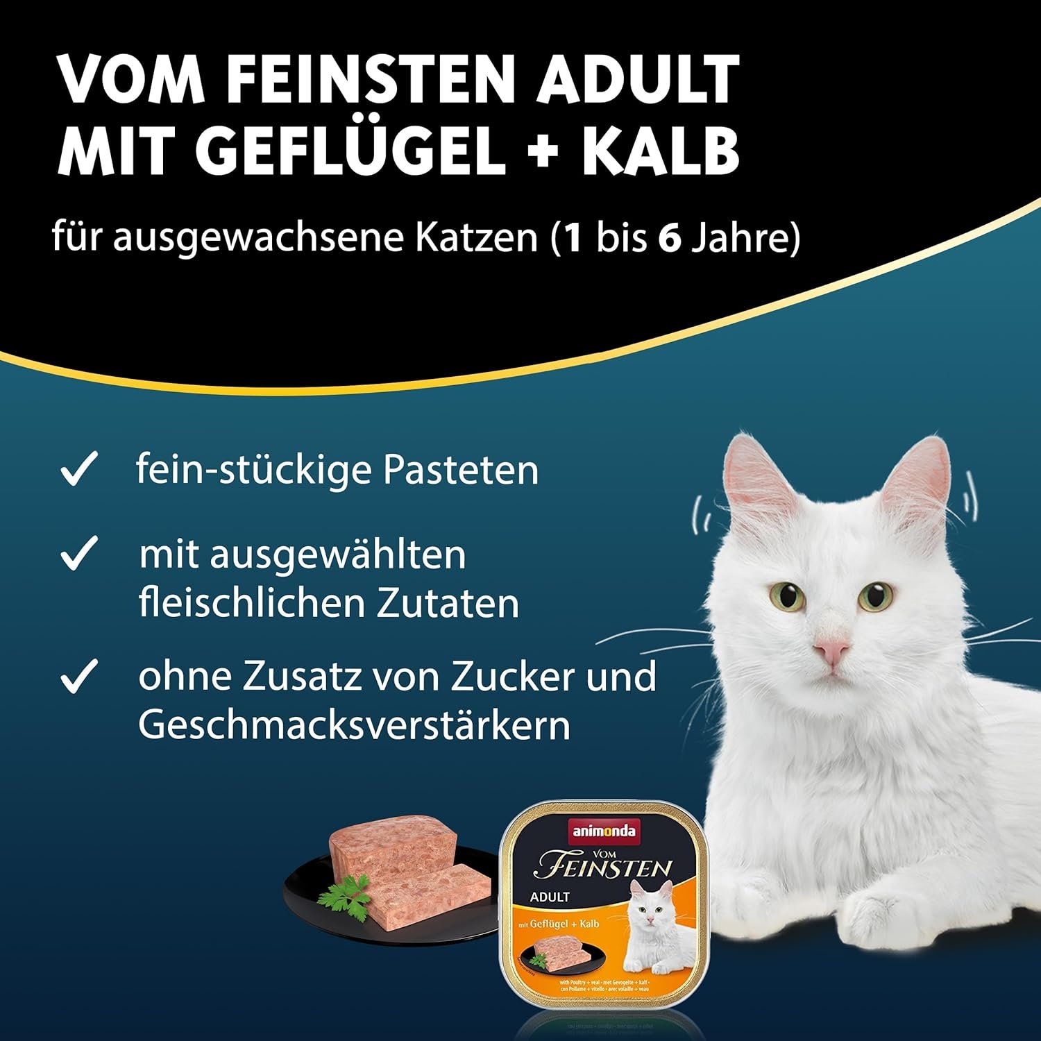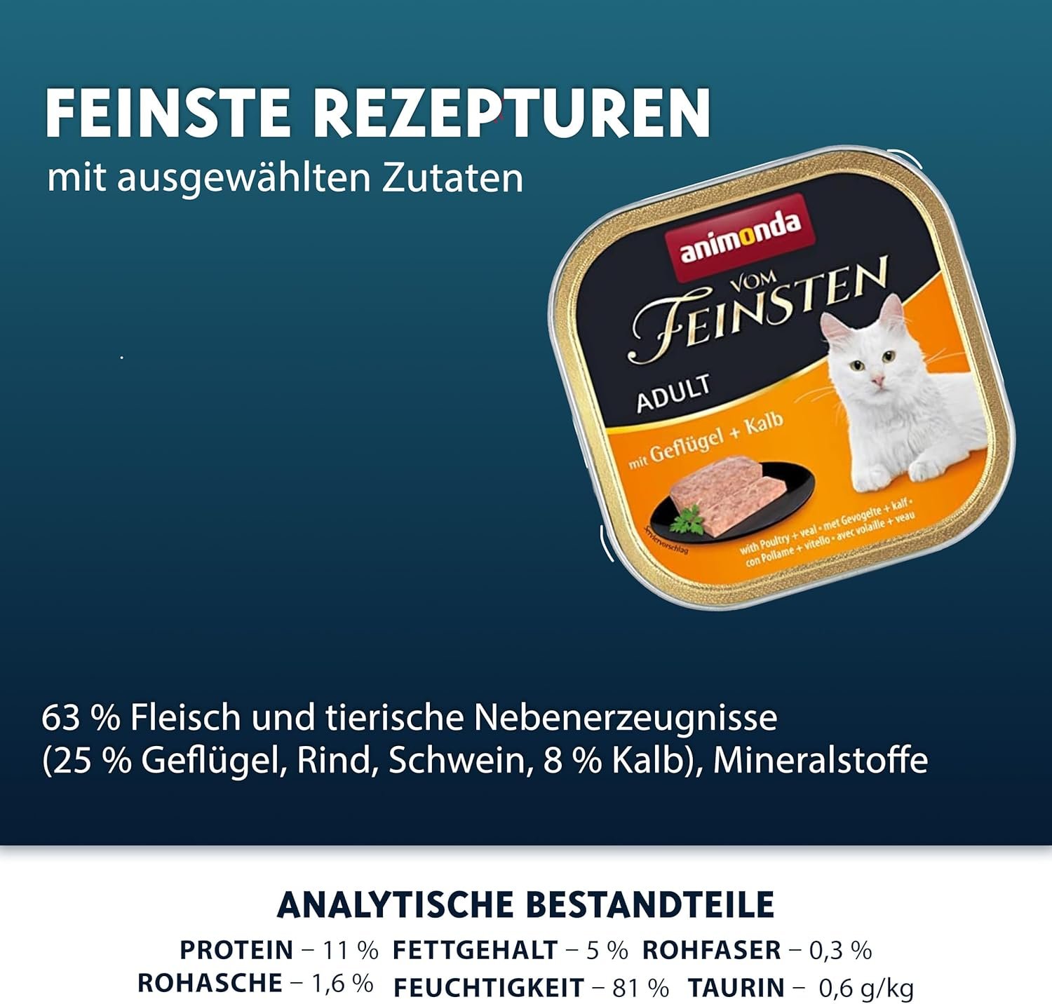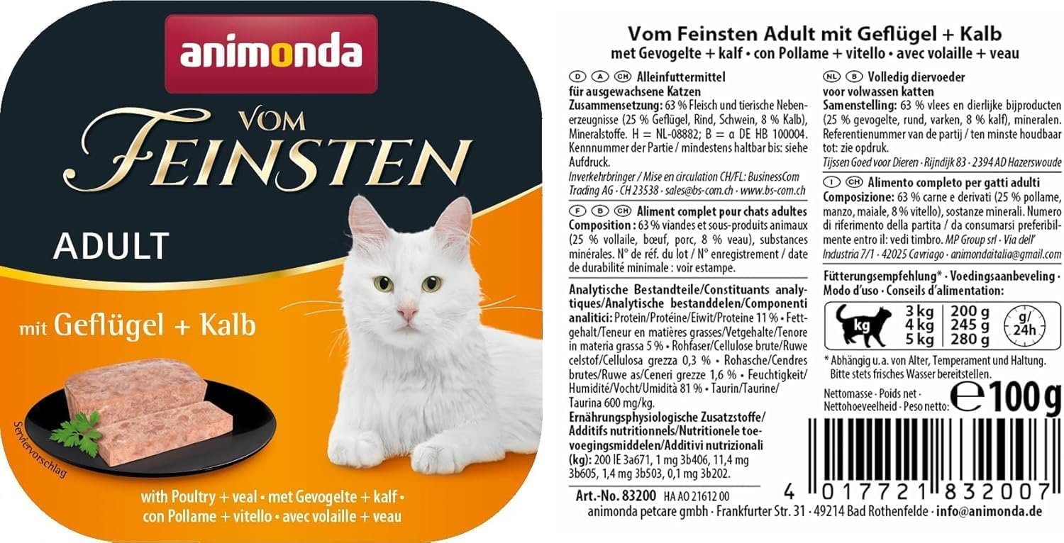 Hochwertige Zutaten: Mit zartem Geflügel und Kalbfleisch, der feinen Textur und seiner besonderen Qualität ist die Katzenfutterpastete genau das Richtige für wählerische Katzen-Feinschmecker.