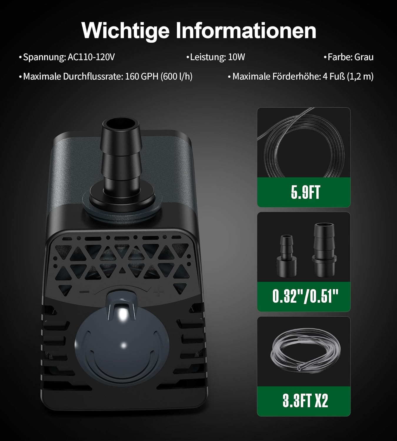 Einstellbarer Wasserdurchfluss: Aquarienpumpen sind mit einem Einstellknopf ausgestattet, mit dem Sie genau den gewünschten Wasserdruck erreichen können. Turbo-Design, stabilere Leistung zur Stärkung der Versiegelung, es wird mit 2 optionalen Düsen geliefert, um verschiedene Ansichten zu erzeugen.