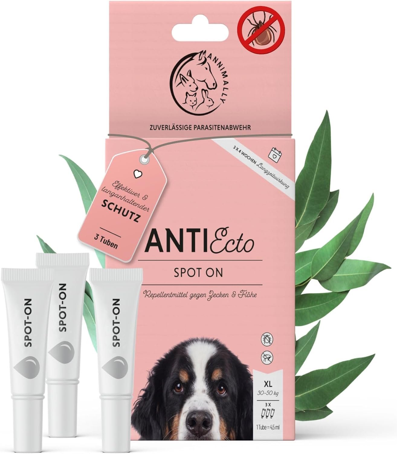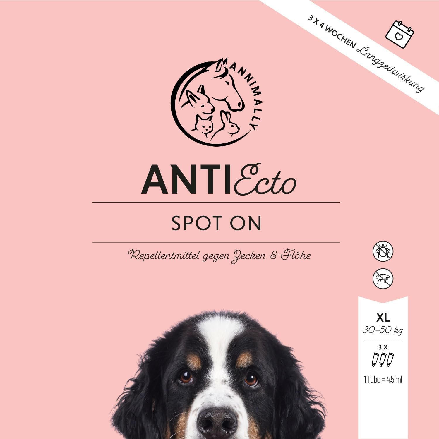 Wirksam gegen Zecken – Schützen Sie Ihren Hund mit unserem AntiEcto Spot-On vor Zecken, Flöhen, Milben, Sandmücken und anderen Ektoparasiten. Unser Spot On bietet wirksamen Schutz für bis zu 3 Monate. Ideal für Hunde zwischen 30 kg – 50 kg ab einem Alter von 16 Wochen.