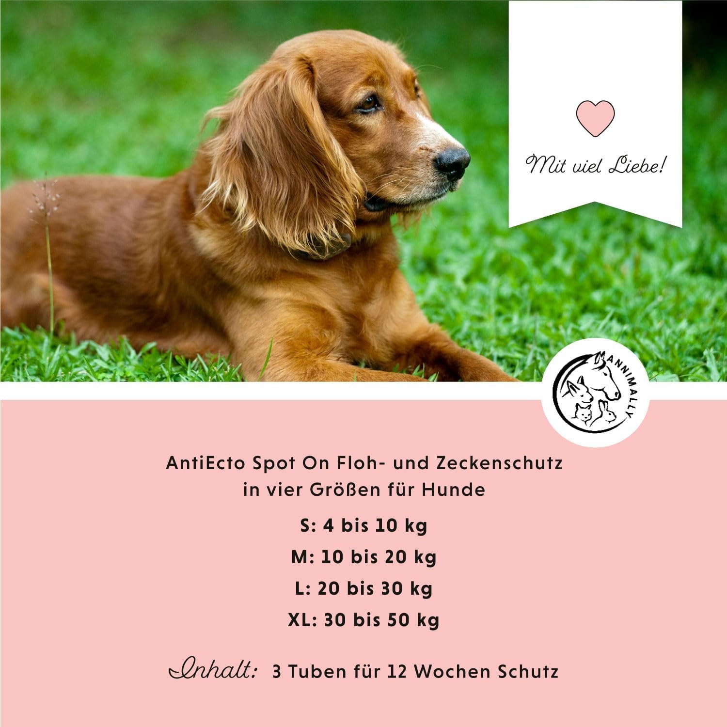 Inhaltsstoffe: Eukalyptus citriodora Öl, hydratisiert, cyclisiert Größe: S: 4 bis 10 kg; M: 10 bis 20 kg; L: 20 bis 30 kg; XL: 30 bis 50 kg Inhalt: 3 Tuben Anwendung: Die Lösung wird entlang der Rückenlinie, von Nacken bis Schwanzansatz, direkt auf die Haut aufgetragen – zuvor das Fell teilen. Die Fellstruktur ermöglicht eine selbstständige Verteilung der Lösung. Aufbewahrung: Bitte lagern Sie das Produkt trocken, lichtgeschützt und nicht über 25°C. Herstellung: Mit viel Liebe in Deutschland hergestellt.