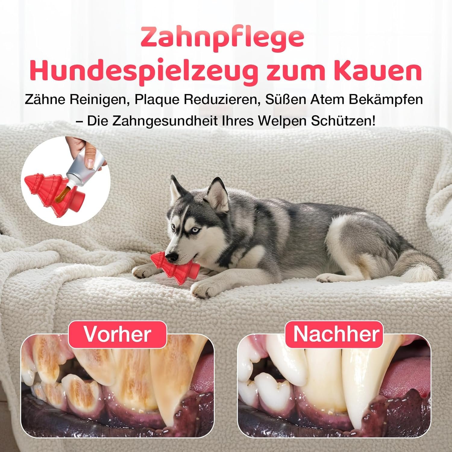 Befriedigt Zahnpflege- und Kaubedürfnisse: Dieses Zahnpflege-Hundespielzeug hilft, Zahnstein zu entfernen und Plaque zu reduzieren – ideal für die Zahnungsphase von Welpen. Das Kauen dieses Hundespielzeugs fördert gesunde Kaugrundlagen, lindert den Juckreiz beim Zahnwechsel und reduziert zerstörerische Kautendenzen (z. B. Möbel). Perfekt als Welpenspielzeug und ständiger Begleiter zum Kauen
