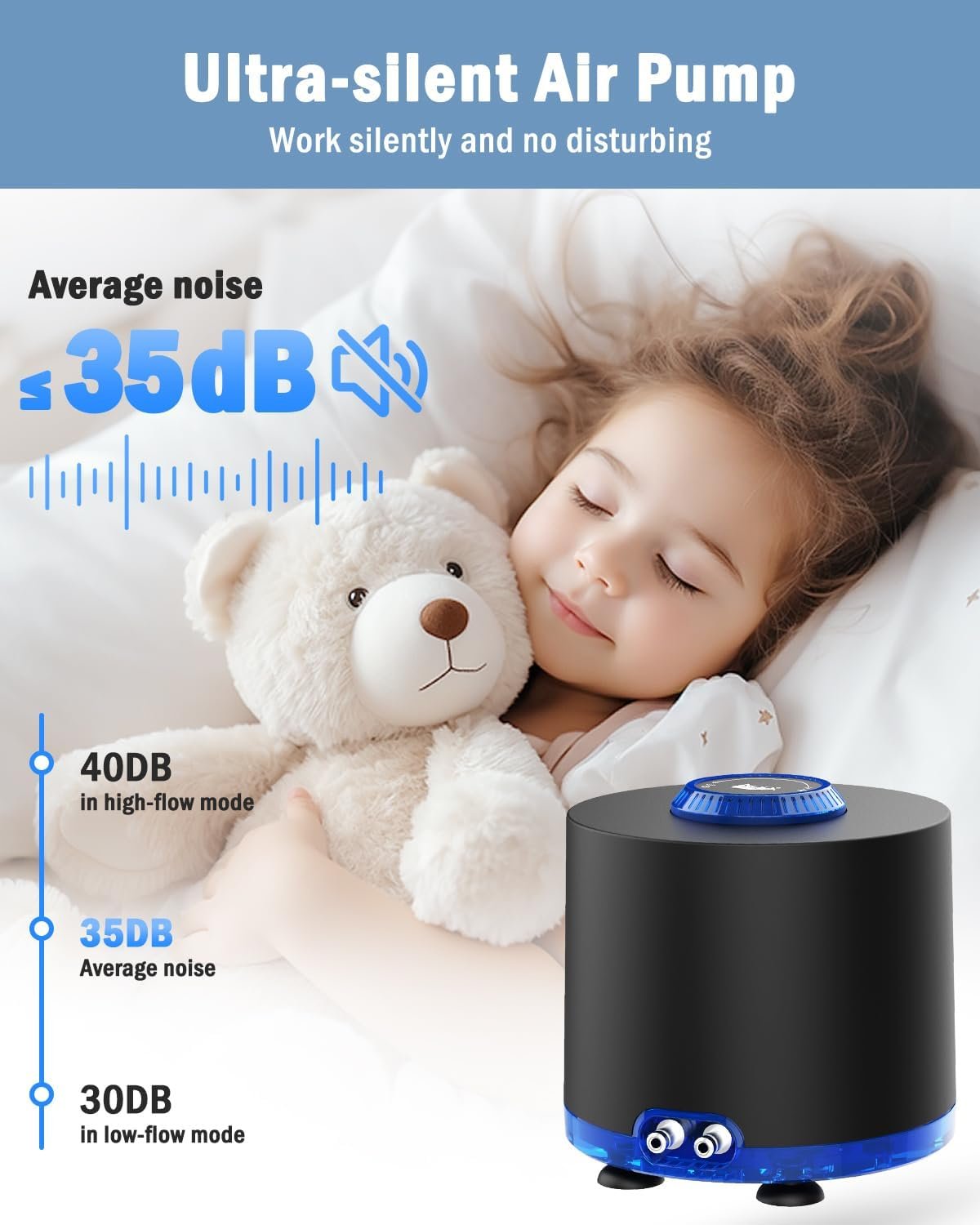 Eine neue Generation leiser Luftpumpen: Die Luftpumpe verfügt über eine langlebige Doppelschichtstruktur mit integrierter Luftpumpe und verdicktem Gehäuse; Die Unterseite der Pumpe ist mit vier weichen Gummipuffern ausgestattet, die nicht nur den Lärm reduzieren (der maximale Lärm überschreitet nicht 35 dB), sondern auch verhindern, dass sich die Pumpe während des Betriebs übermäßig bewegt