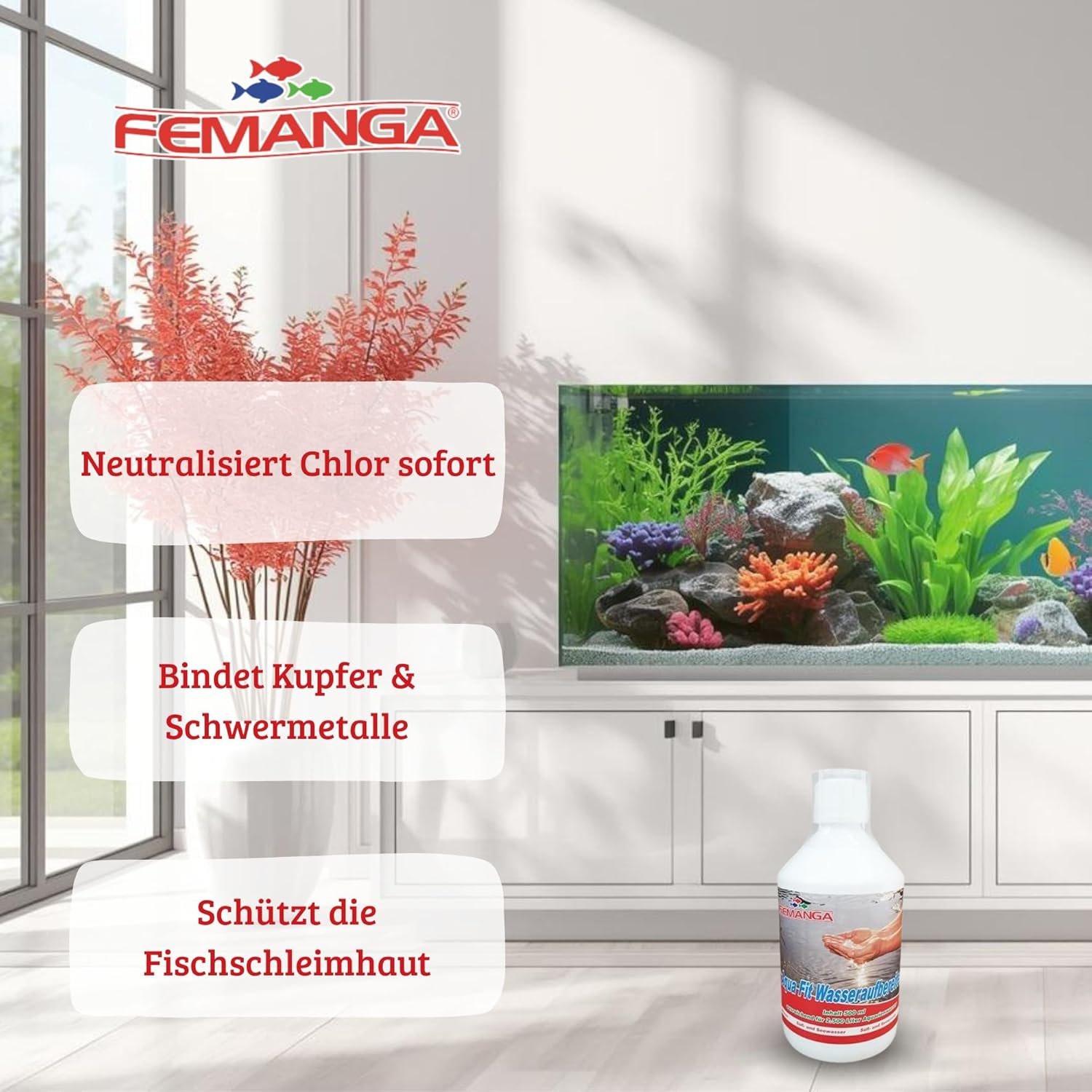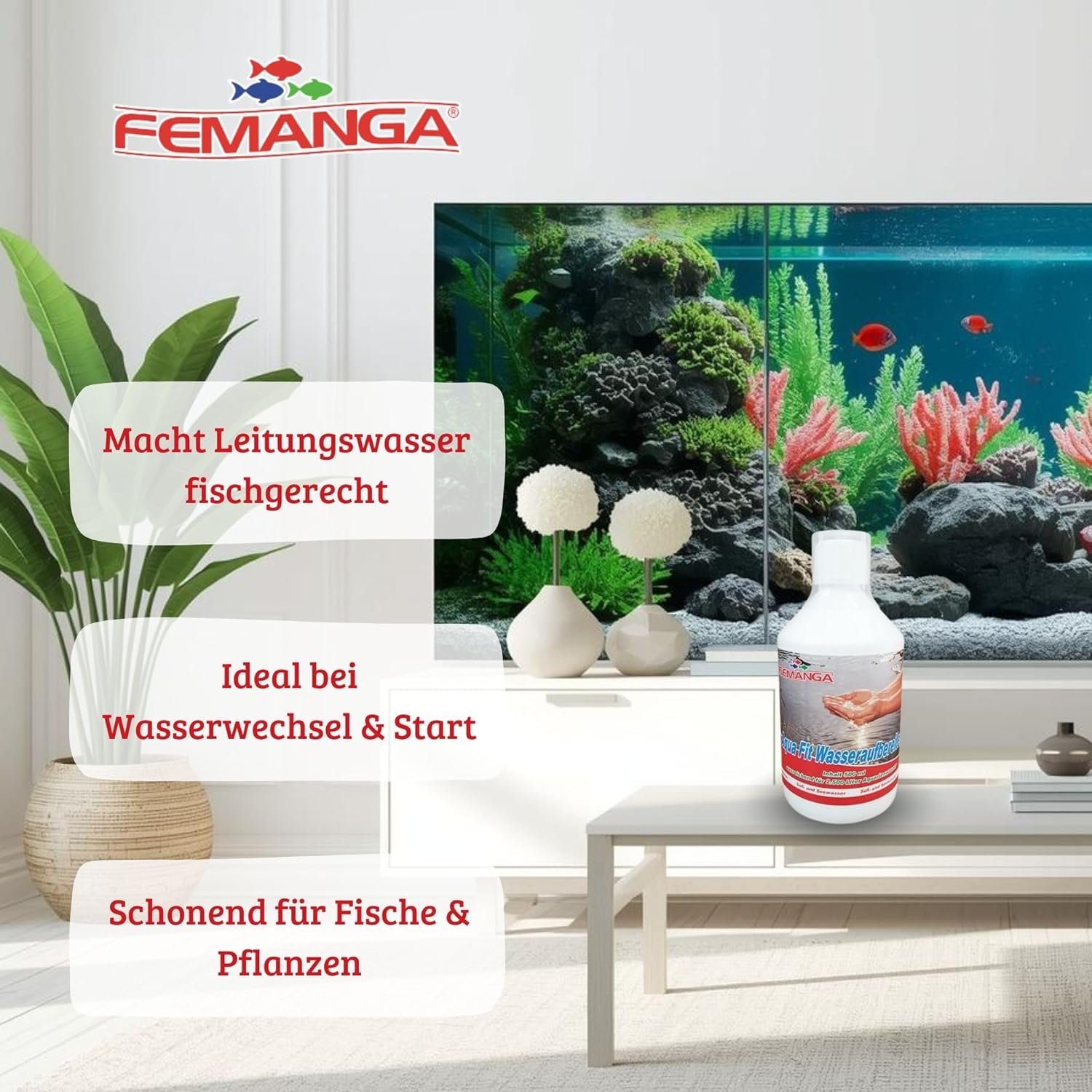 Der Femanga Aqua Fit Wasseraufbereiter ist die ideale Lösung für alle Aquarienliebhaber, die Wert auf sauberes, klares und fischfreundliches Wasser legen. Unsere hochwirksame Formel entfernt zuverlässig Schadstoffe wie Chlor, Schwermetalle und andere Schadstoffe, die die Gesundheit Ihrer Fische und Pflanzen beeinträchtigen können. Mit nur einer Anwendung sorgt Femanga Aqua Fit dafür, dass das Wasser sofort fischfreundlich und biologisch stabilisiert ist – die Grundlage für ein langes, gesundes Leben Ihrer Aquarienbewohner. PRODUKTVORTEILE Effektive Wasserreinigung: Neutralisiert Chlor und Schwermetalle und verbessert sofort die Wasserqualität. FISCHE UND PFLANZEN SCHÜTZEN – Schützt die empfindlichen Schleimhäute von Fischen und unterstützt das natürliche Ökosystem. Einfache Anwendung: Ein paar Tropfen genügen, um das Wasser optimal aufzubereiten – perfekt für Einsteiger und erfahrene Aquarianer. KLARES WASSER IN KÜRZE ZEIT: Sorgt für ein reines und kristallklares Aquarium, in dem sich Ihre Fische und Pflanzen sichtlich wohl fühlen. Empfohlene Anwendung: Femanga Aqua Fit bei jedem Wasserwechsel oder bei Bedarf verwenden. Für die optimale Dosierung beachten Sie bitte die Hinweise auf der Verpackung. Erleben Sie den Unterschied mit Femanga Aqua Fit – der einfache Weg für gesunde und zufriedene Aquarienbewohner!