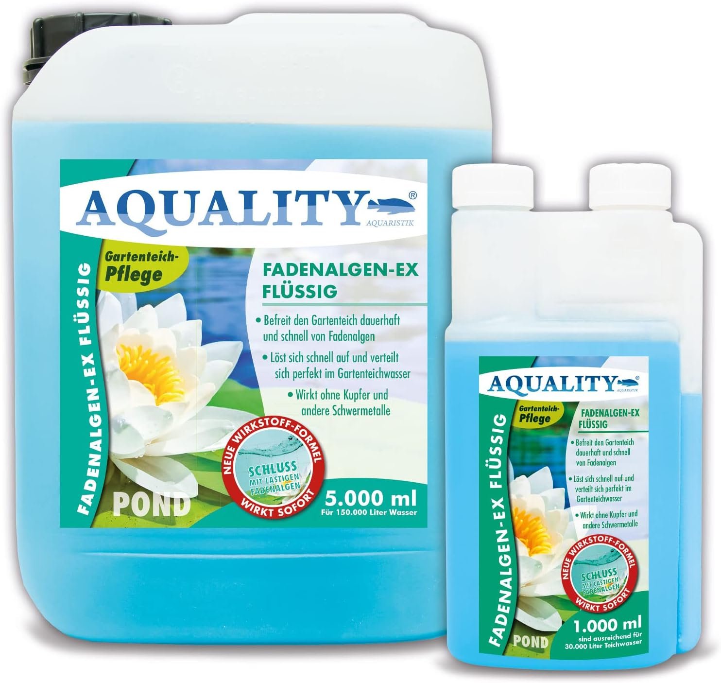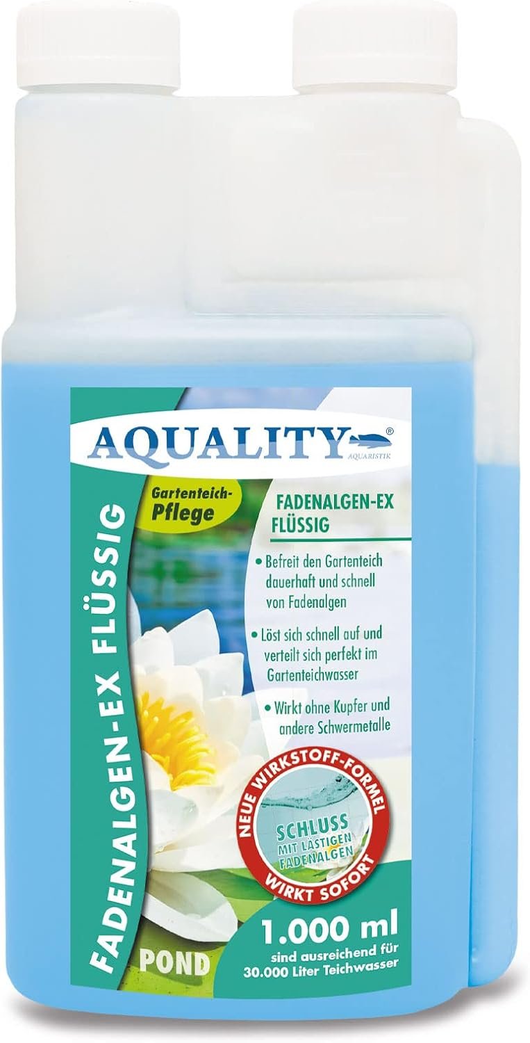 Mit Aquality bekommen Sie jedes Algenproblem in den Griff, während Sie gleichzeitig mehr davon entfernen, was zu einem Grundreinigungsbedarf führen kann. Aquality Fadenalgen-Flüssigkeit Pond entfernt mit seiner bewährten 3-Wochen-Formel im Gartenteich schnell und dauerhaft unschöne Algen. Der Pool wird zu einem wunderschönen – . Als perfekte Kombination mit einem starken Algenwachstum hat sich die Verwendung eines hochwertigen Bio-Teich-UV-Schutzteichs bewährt, der das Sonnenlicht direkt filtert und dadurch das Algenwachstum stoppt. Wenn Sie beide hochwertigen Qualitätsprodukte zusammen verwenden, dann hat Ihr Algenproblem die Vergangenheit gewonnen.