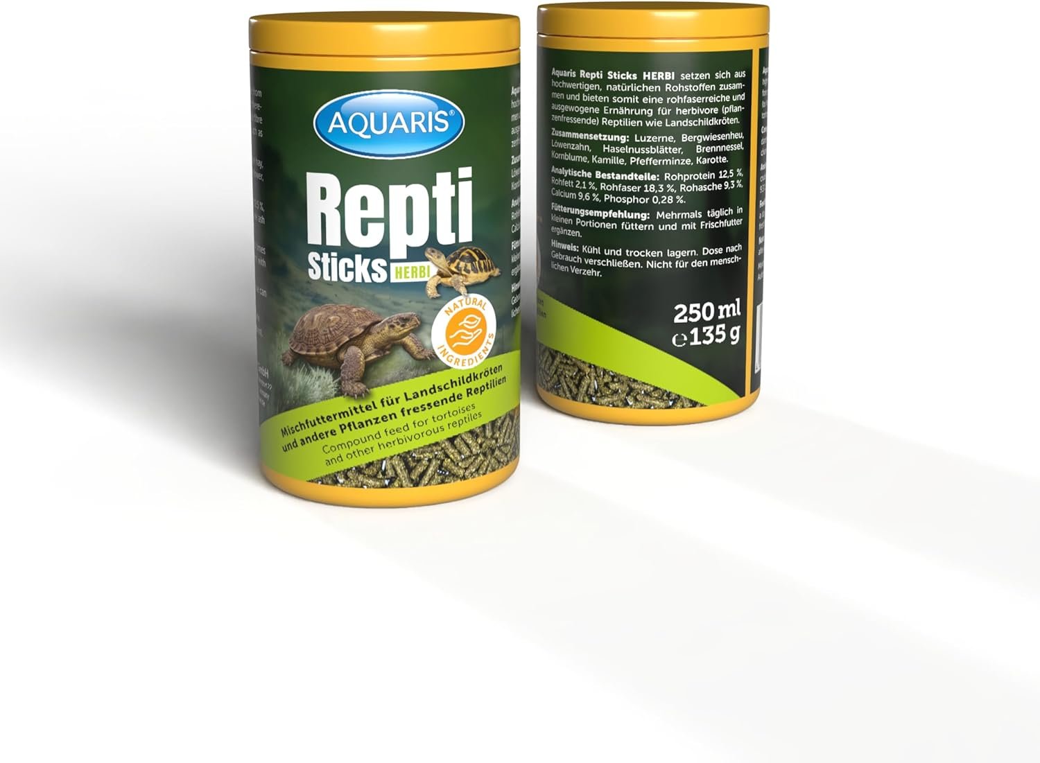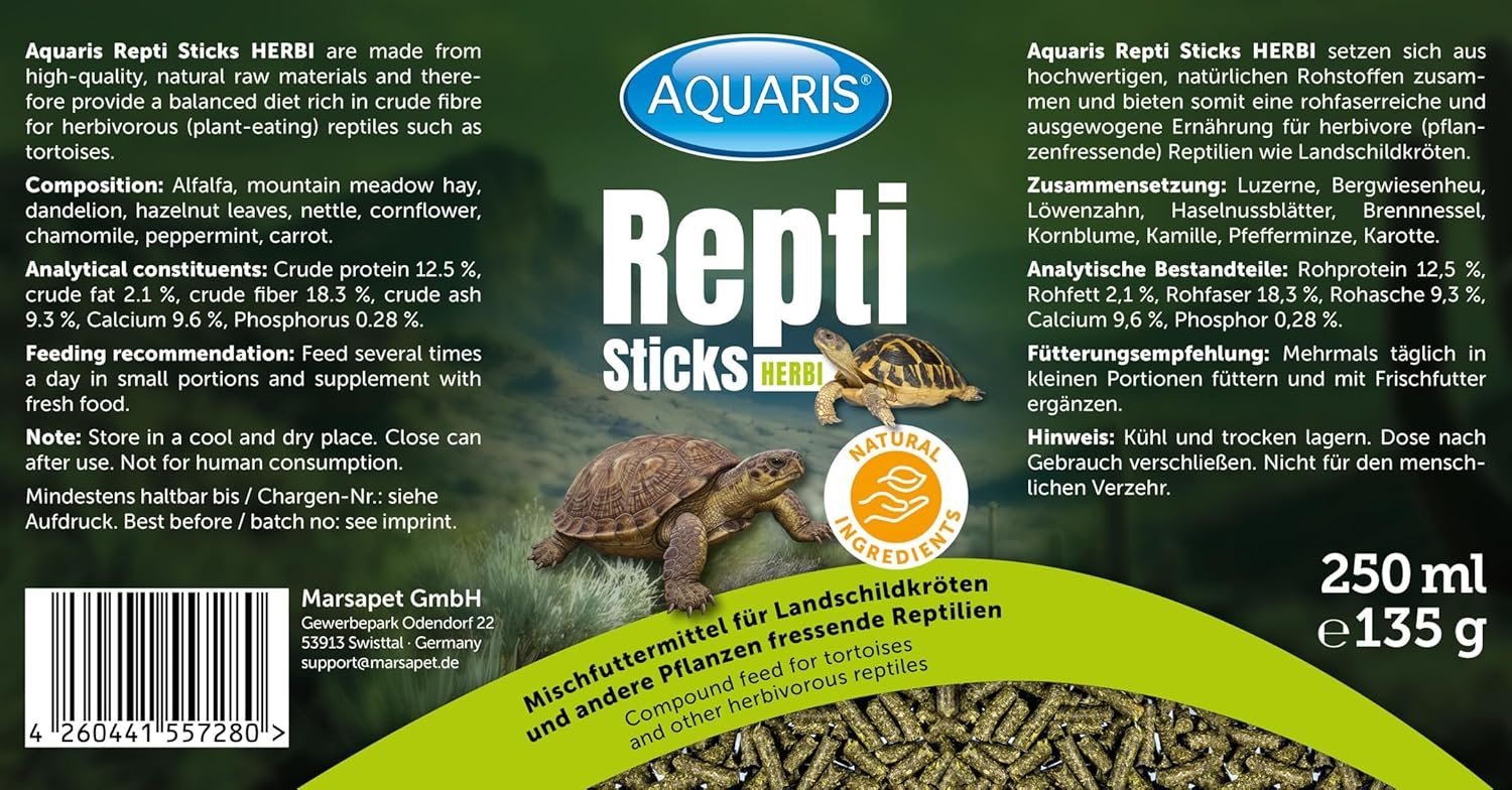 „Natürliche Ernährung für gesunde Landschildkröten Landschildkröten faszinieren durch ihre Ruhe, Langlebigkeit und Einzigartigkeit. Damit sie vital und gesund bleiben, benötigen sie eine artgerechte Ernährung mit einem hohen Anteil an Pflanzen und Kräutern. Ungeeignetes oder zu energiereiches Futter kann bei Schildkröten zu Verdauungsproblemen, Wachstumsstörungen oder Beckenverformungen führen. Bei Aquaris wissen wir, wie entscheidend die richtige Ernährung für die Gesundheit Ihrer Tiere ist – deshalb haben wir mit den Aquaris Repti Sticks Herbi ein rein pflanzliches Futter entwickelt Das ist das Besondere an Aquaris Repti Sticks Herbi. Es enthält ausschließlich schonend getrocknete, natürliche Rohstoffe wie Luzerne, Kornblumen, Kamille, Pfefferminze und Karotten Das Futter ist optimal verwertbar – ideal für Griechische Landschildkröten, Landschildkröten und andere Arten. Die wichtigsten Vorteile von Aquaris Repti Sticks Herbi – entwickelt für eine ausgewogene und natürliche Ernährung – ideal für Griechische Landschildkröten, Landschildkröten und Breitrandschildkröten – developed and produced to the highest standards for vital reptiles. Feeding recommendation. Feed Aquaris Repti Sticks Herbi several times a day in small portions. The food can be left dry or slightly moistened. Supplement it regularly with fresh green food and ensure an adequate drinking water supply. Store dry and cool after use – so the food stays fresh and aromatic for a long time. Aquaris – Experience and responsibility in reptile nutrition. For many years, Aquaris has stood for high-quality and natural feed for reptiles and ornamental fish. Our Rezepturen entstehen in enger Zusammenarbeit mit Tierernährungsexperten und Reptilienbesitzern. Wir setzen auf natürliche Inhaltsstoffe, schonende Verarbeitung und wissenschaftlich abgestimmte Mischungen – für eine gesunde, artgerechte und nachhaltige Ernährung Ihrer Schildkröten.