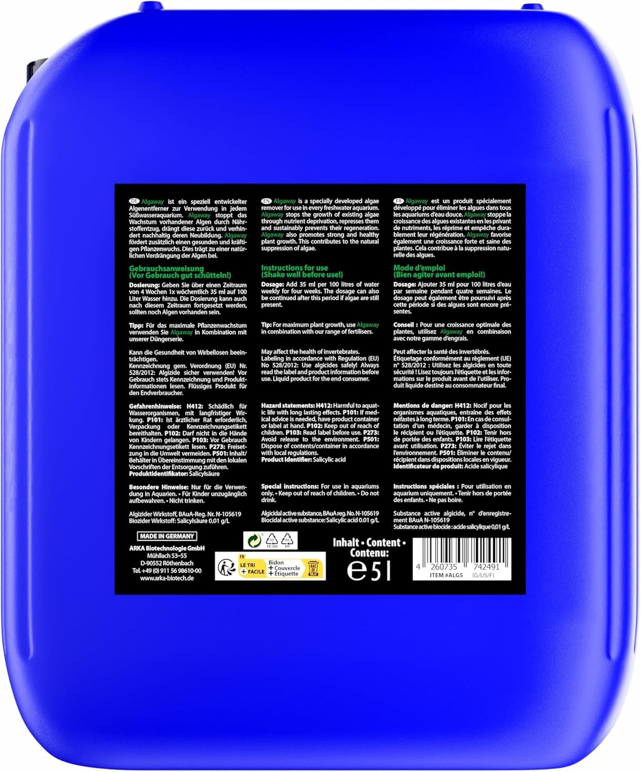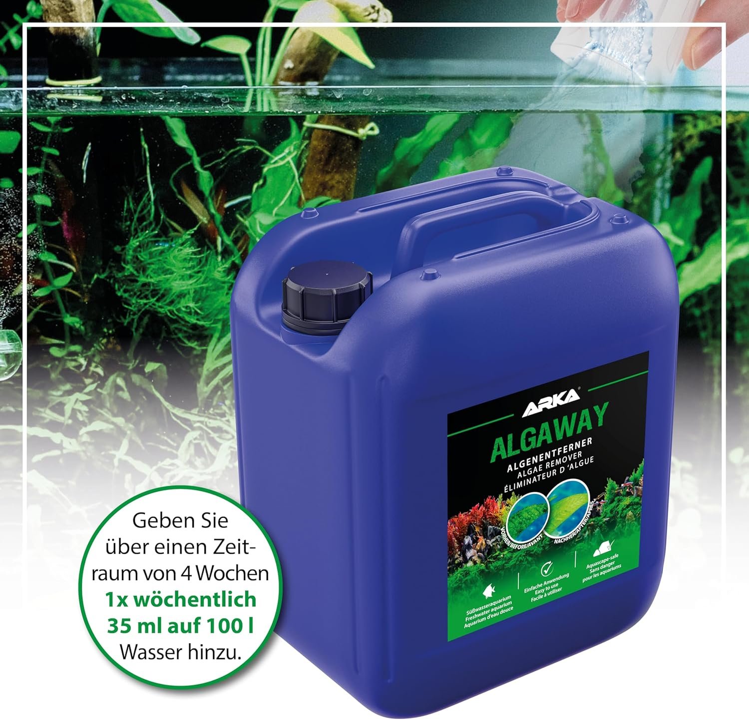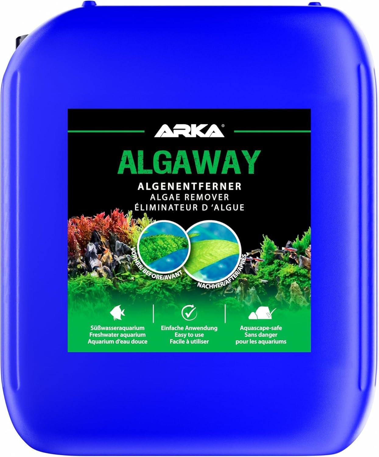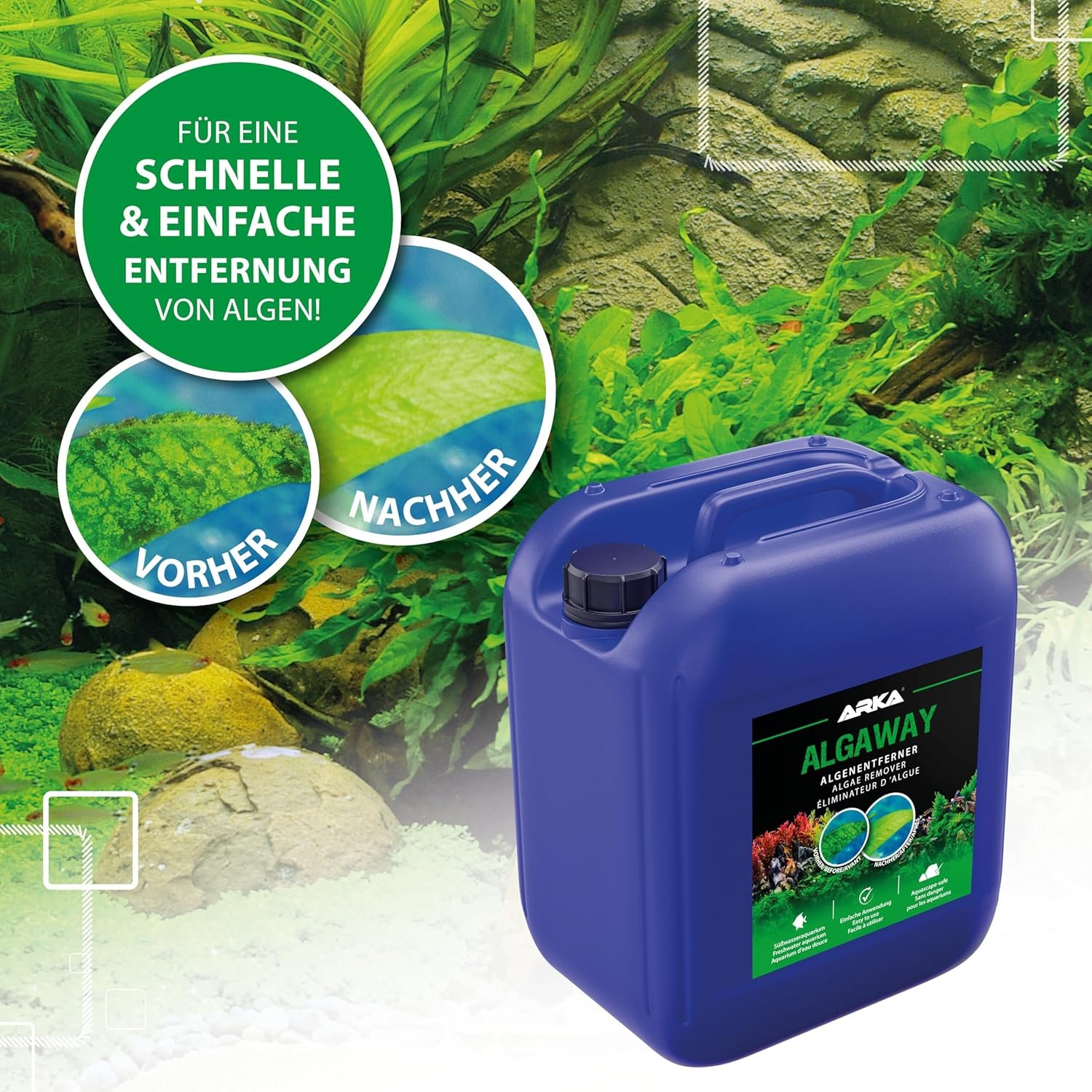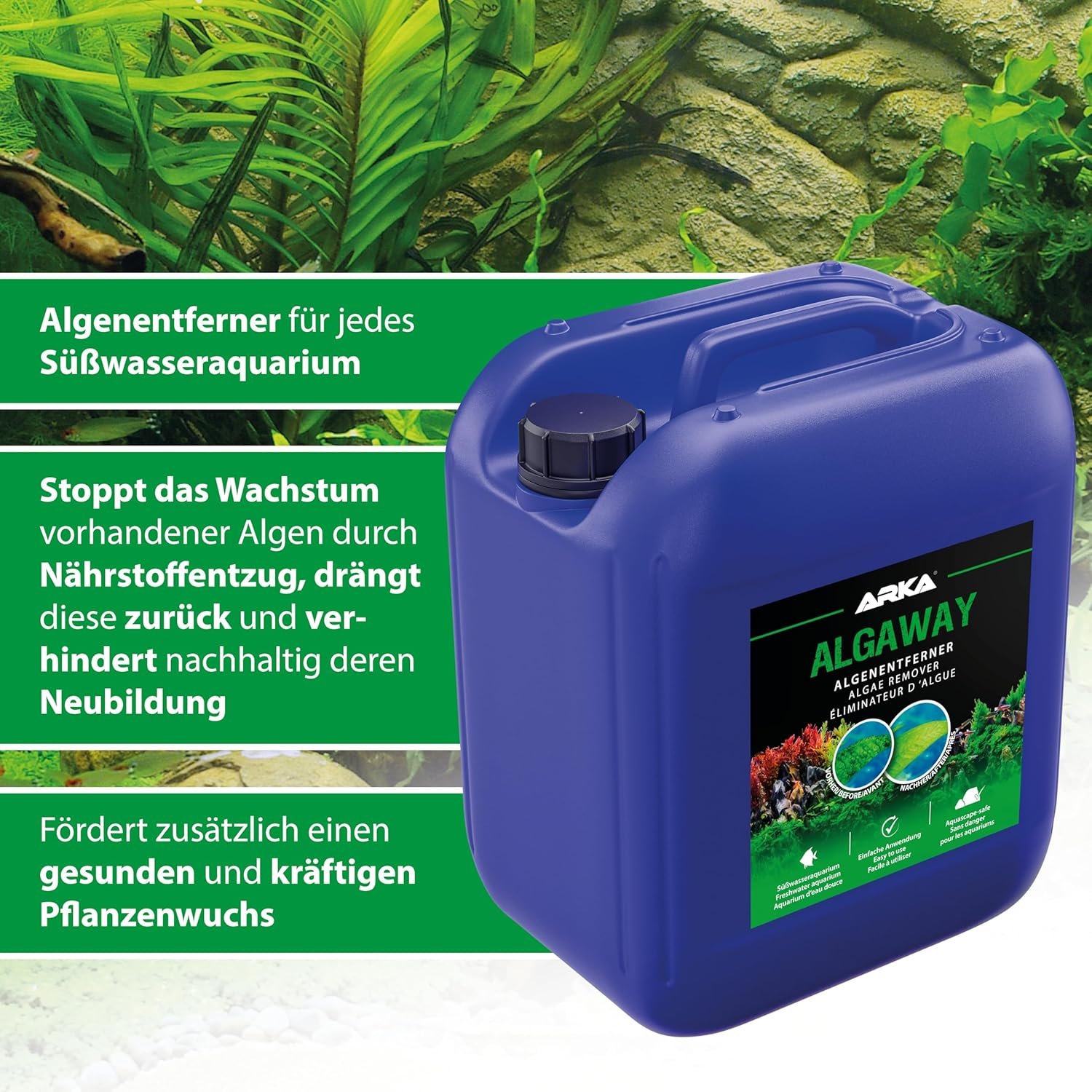 Algaway ist ein speziell entwickelter Algenentferner für den Einsatz in jedem Süßwasseraquarium. Algaway stoppt das Wachstum bestehender Algen durch Nährstoffentzug, drängt sie zurück und verhindert nachhaltig deren Neubildung. Algaway fördert außerdem ein gesundes und kräftiges Pflanzenwachstum. Dies trägt zu einer natürlichen Verdrängung der Algen bei.